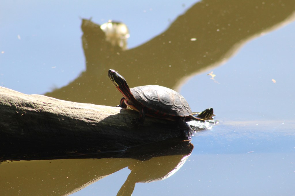 Painted Turtles usually live between 20 and 30 years but some have been known to survive for 50 years. When you see the feet of Painted Turtles you may notice that some of them have long nails while others have relatively short ones. The long-nailed ones are the males and they use them to stroke the female turtle on the head to indicate interest in mating. If she is tickled correctly she will dive to the bottom of the water and wait for him to come and mate. When I took the picture below I thought there was just one turtle in it but a second one decided to photobomb my picture. That was nice of it.