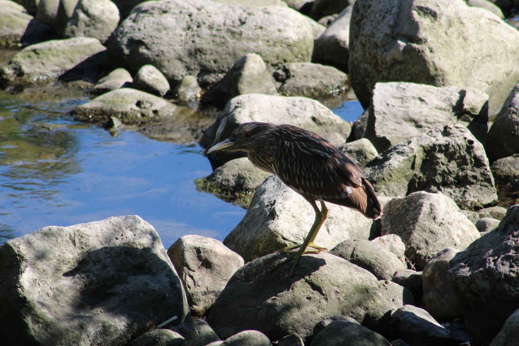 Although the pond has been home to a Great Blue Heron for the past several summers it was a pleasant surprise to see a juvenile Black-crowned Night Heron standing on the rocks at the storm water outfall into the pond. Juveniles have a brown colour with lighter streaks and a pale yellow beak. As they mature the belly turns a pale white and they develop a black crown and back. As their name suggests, they are nocturnal and do most of their feeding in the evenings. During the day they can be hard to spot because they sleep in trees or dense foliage. The average Black-crowned Night Heron can expect to live for about 20 years.