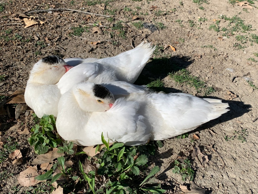 Call Ducks are domesticated and sometimes kept for pets. They were developed in the mid-19th century as hunting ducks. They were specifically bred to be smaller than average ducks so that they could lure other ducks into funnel traps and then escape through the small exit. They also have a distinct call that carries well and can lure wild ducks from great distances. With the advent of duck whistles and the decline in popularity of hunting, Call Ducks became relatively rare. In the mid-20th century they made a come-back as show ducks and as livestock on hobby farms where they are raised for eggs and food. The pair of Call Ducks at Marita Payne Pond were quite attached to each other and when they decided to sleep they snuggled up and dozed off.