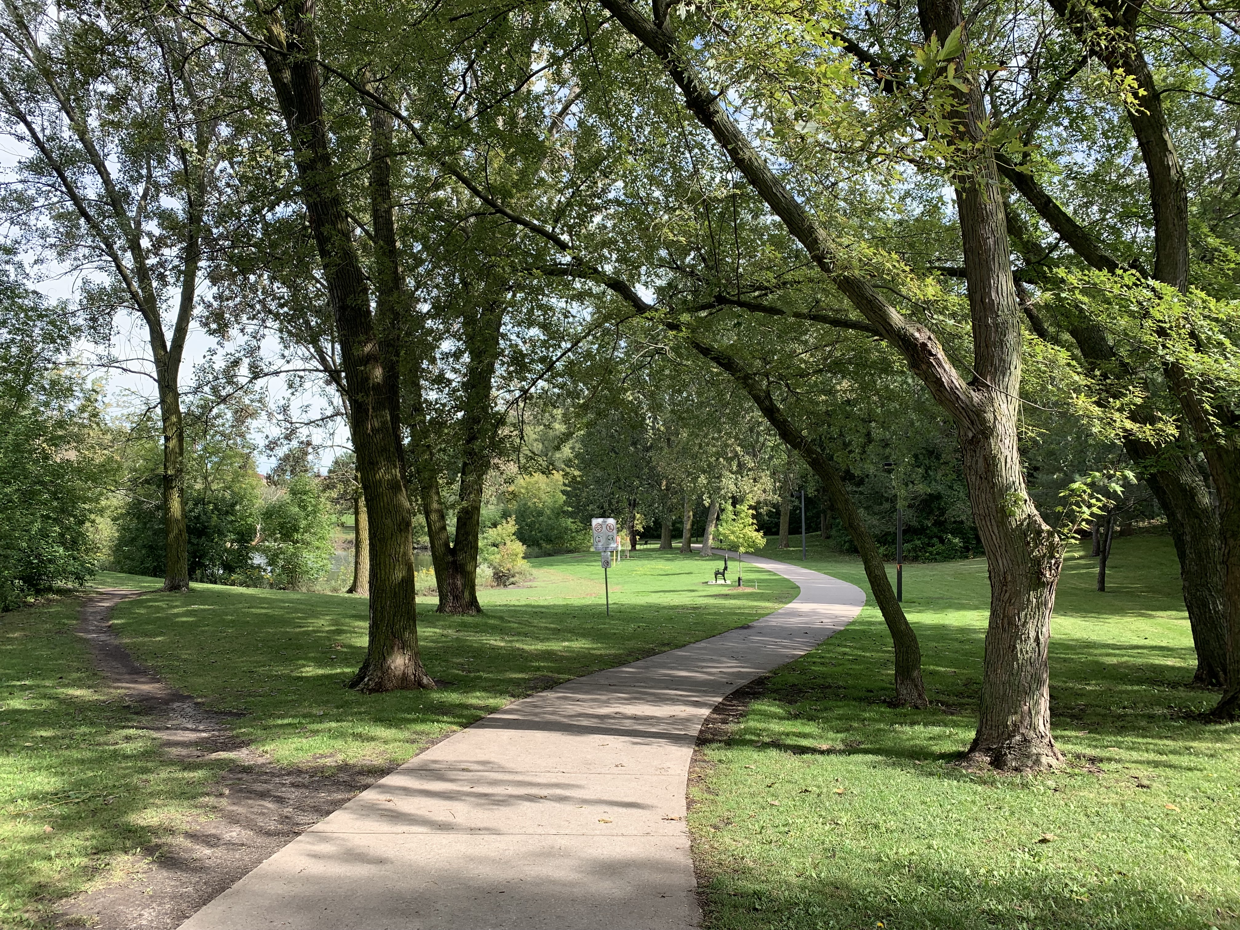 The trail through Marita Payne Park is part of the Bartley-Smith Greenway, a 15-kilometer trail that follows the West Don River. As you follow it north-west you pass under the Glen Shields Avenue bridge and the trail changes to fine gravel from pavement. The park also become a little less maintained between here and and where it passes under the bridge for Highway 407.