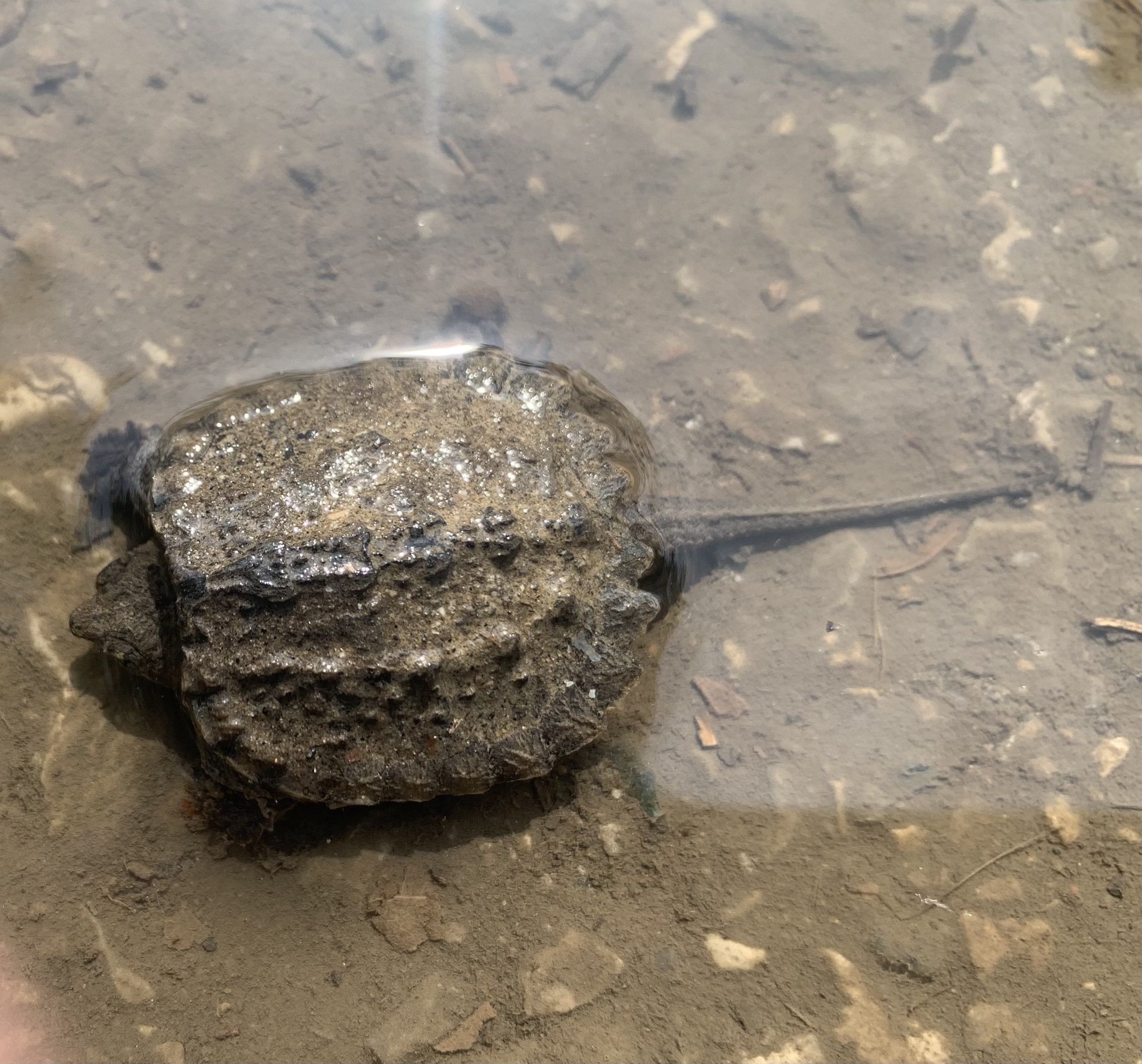 We often look for loop trails so that we can experience more terrain without having to go back over sections we already explored. Trails along the rivers in the GTA tend to be “out and back” as the parks are normally only as wide as the floodplain of the waterway they surround. It’s amazing how often we see something on the way back that was missed on the outward part of the journey. This time it was a baby Snapping Turtle that was lying in a puddle on the edge of the path. It looked a lot like a leaf in the water and could have easily been stepped on or crushed by a bike tire. Snapping Turtles can live up to 45 years in the wild and this one will have a better chance after I moved him up onto the grass between the path and the river.