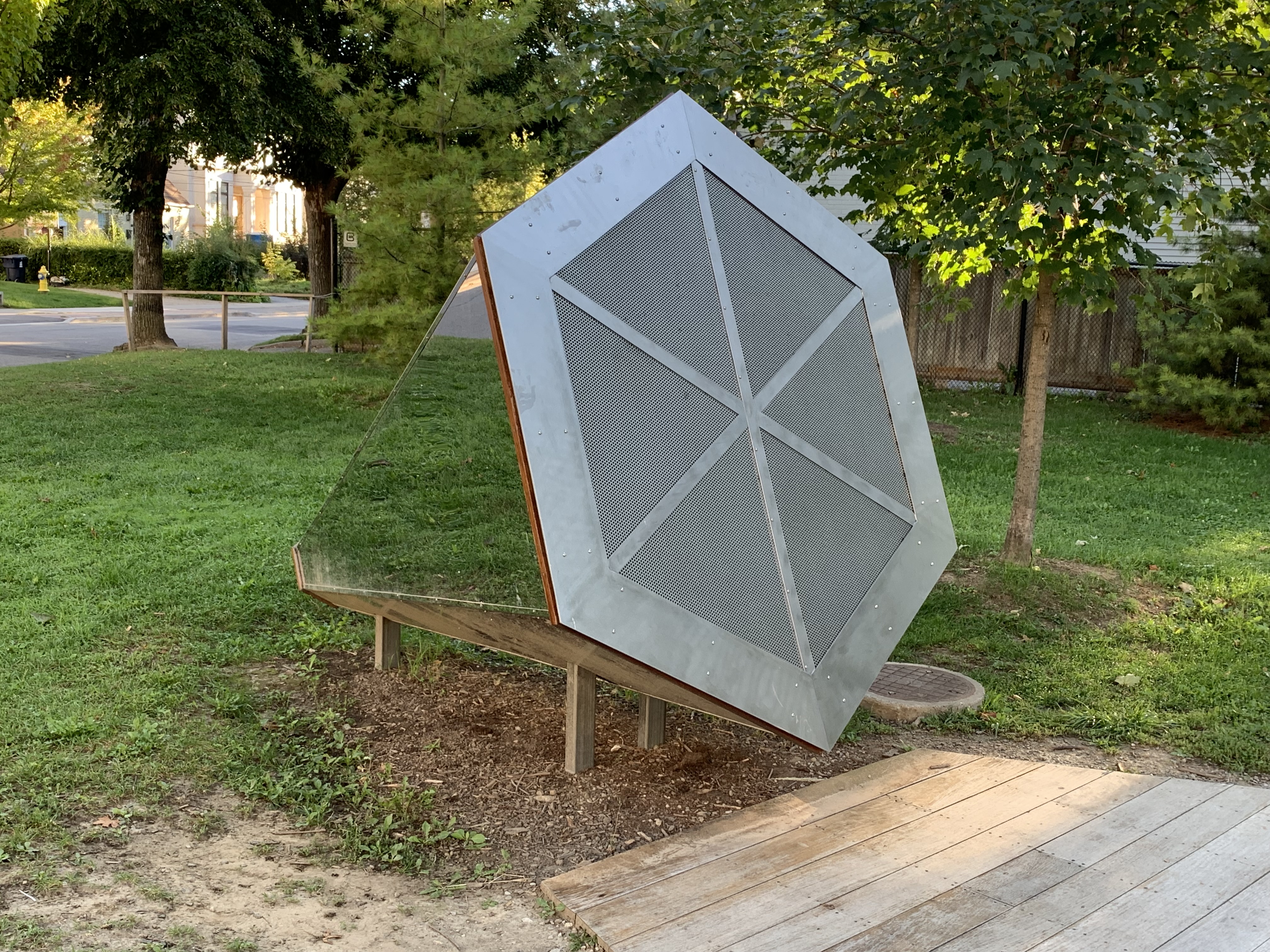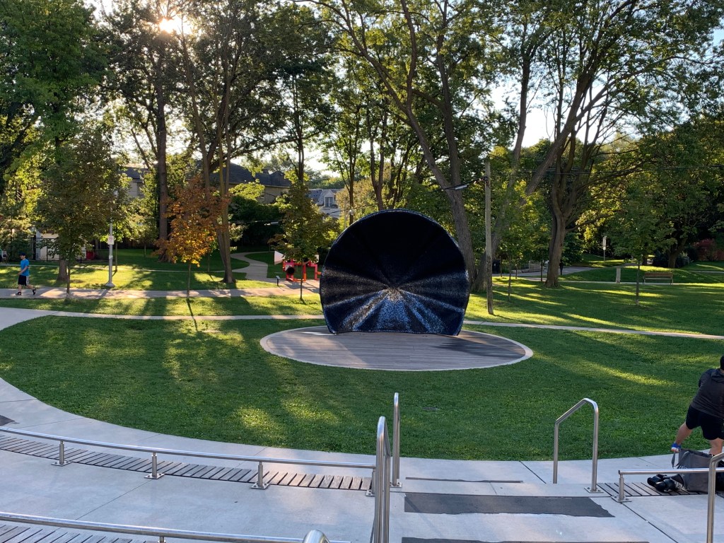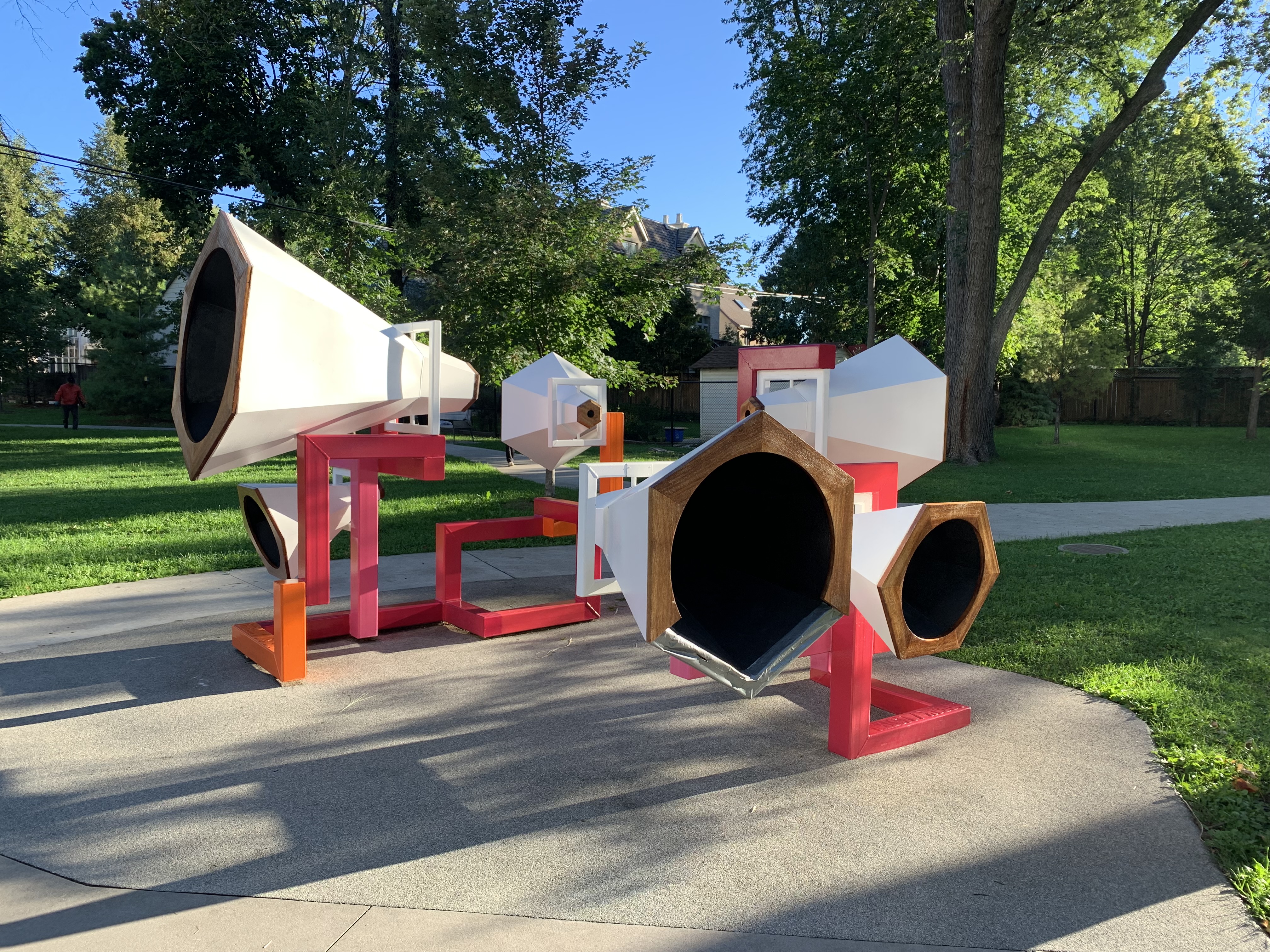 There is a permanent three part art installation in the park called 120 Mirrors which is inspired by the gramophone. The Horn of Reflection was created as a space for someone to sit inside and enjoy the soundscape as it is captured and amplified by the shape. However, you can’t get into the cone anymore because the end has been closed off.