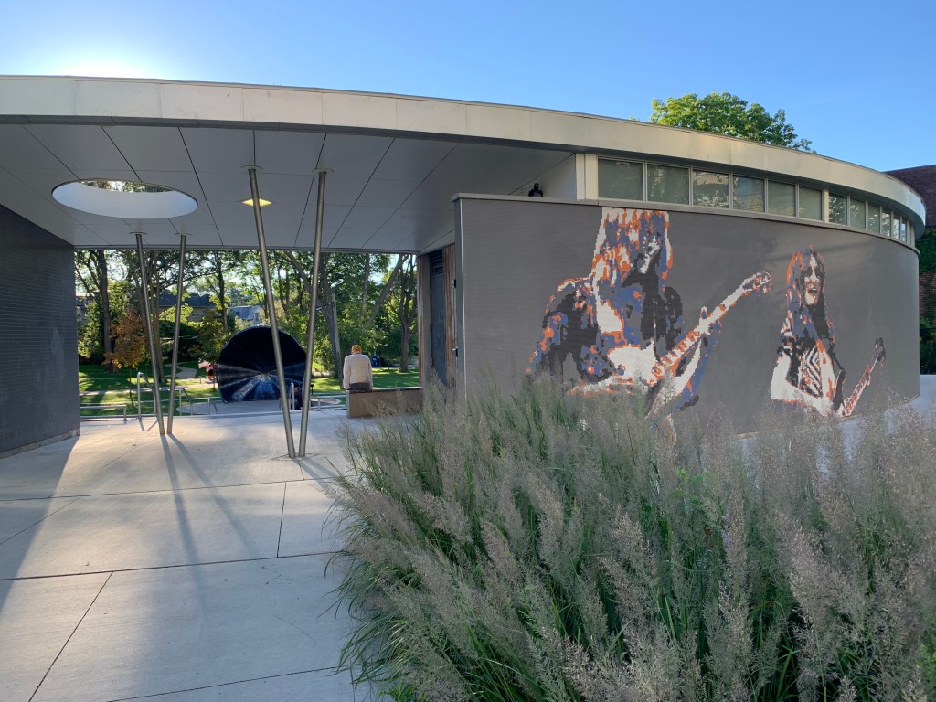 The bandshell in Lee Lifeson Art Park is fittingly named Limelight after one of the songs on Rush’s 1981 album Moving Pictures. It was their most successful record, having sold over 5 million copies. Limelight was designed on a computer to amplify and direct sound with the best acoustics possible. It is based on a parabolic reflector and is covered with thousands of black glass mosaic tiles. It allows formal and informal presentations to be heard throughout the park. Limelight was created by Paul Raff Studios who also did the mosaic mural of Lee and Lifeson that can be seen in the cover photo and also later in the article.