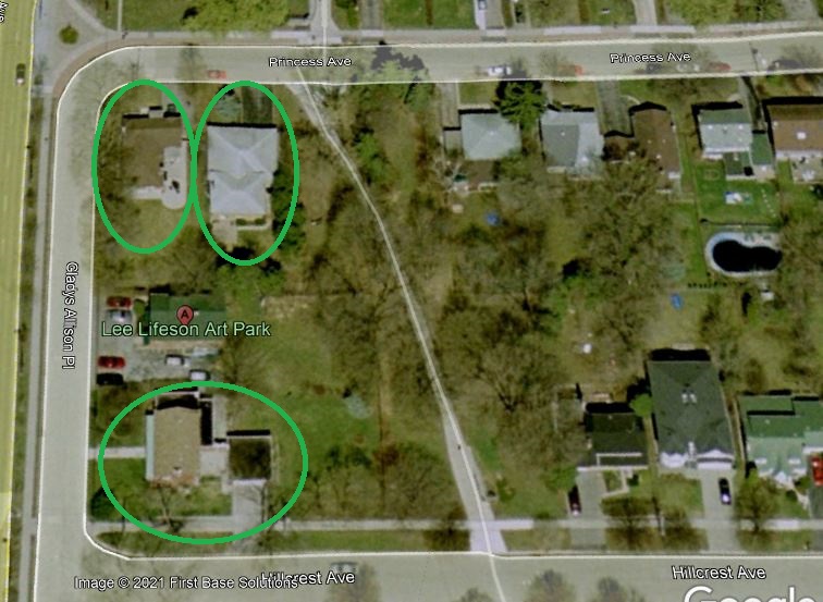 The one remaining house on the property was purchased by the city in 2015 for just over $2,058,000 with the intention of demolishing it and adding the property to the park. The current tenant was given a four year lease with three options to renew for a five year period each. Therefore, it could be 2034 before this becomes part of the park. The city has acquired several other properties with the intention of expanding Willowdale Linear Park. The December 2015 Google Earth capture below shows the three yet to be demolished houses circled in green while the one remaining home has the park name written over the roof.