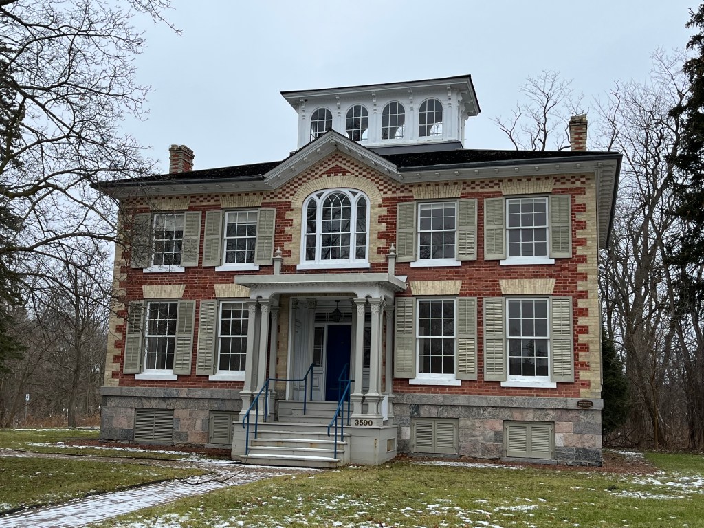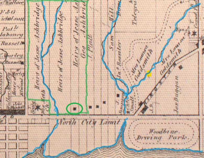 This capture from the County Atlas of 1877 shows the properties that were still under the Ashbridge family at that time. I’ve also circled the Jesse Ashbridge home in green. Ashbridge Creek is shown flowing through the property and in the early days, it was used to take a boat down to the lake and back. It has since been filled in and is represented by a depression on the grounds of the Ashbridge Estate property.