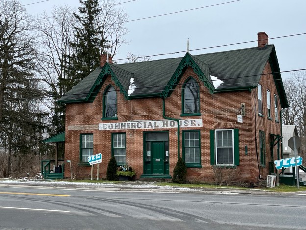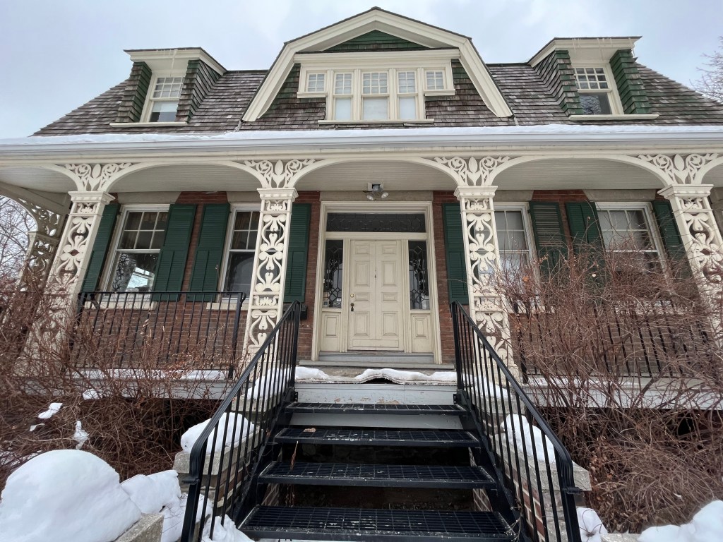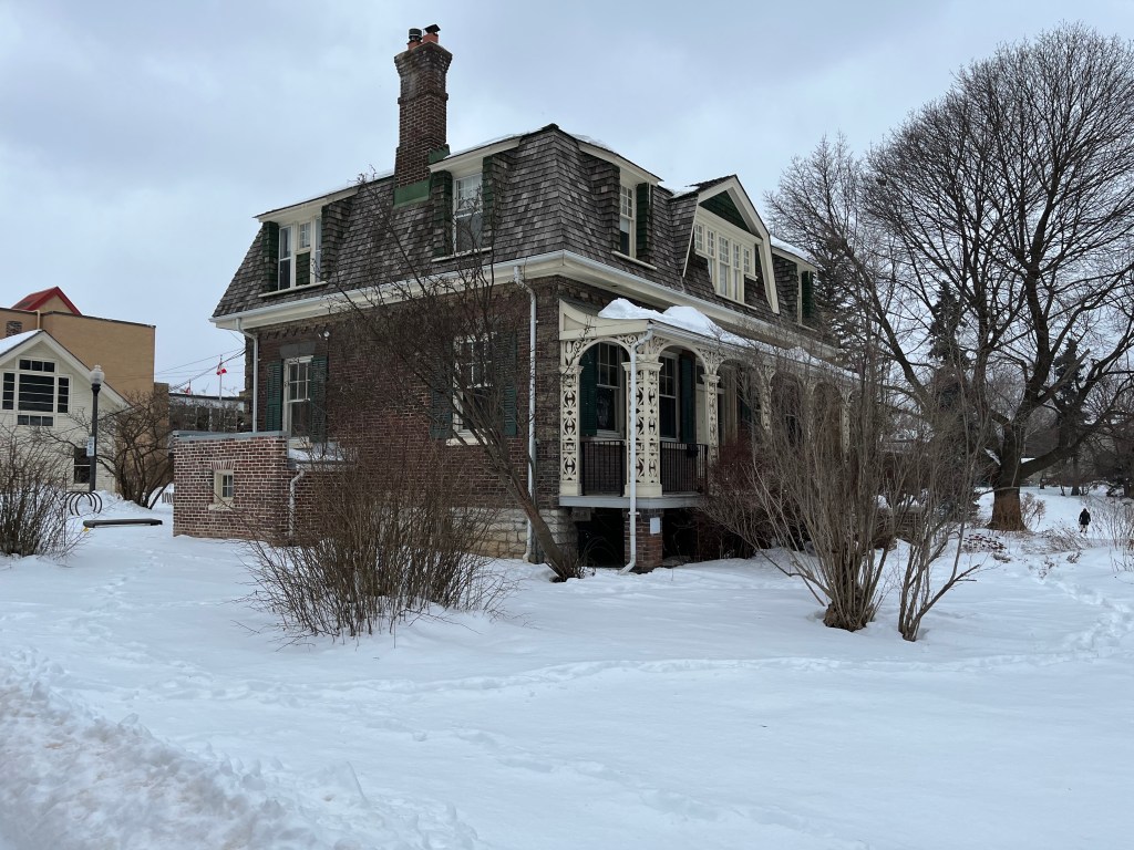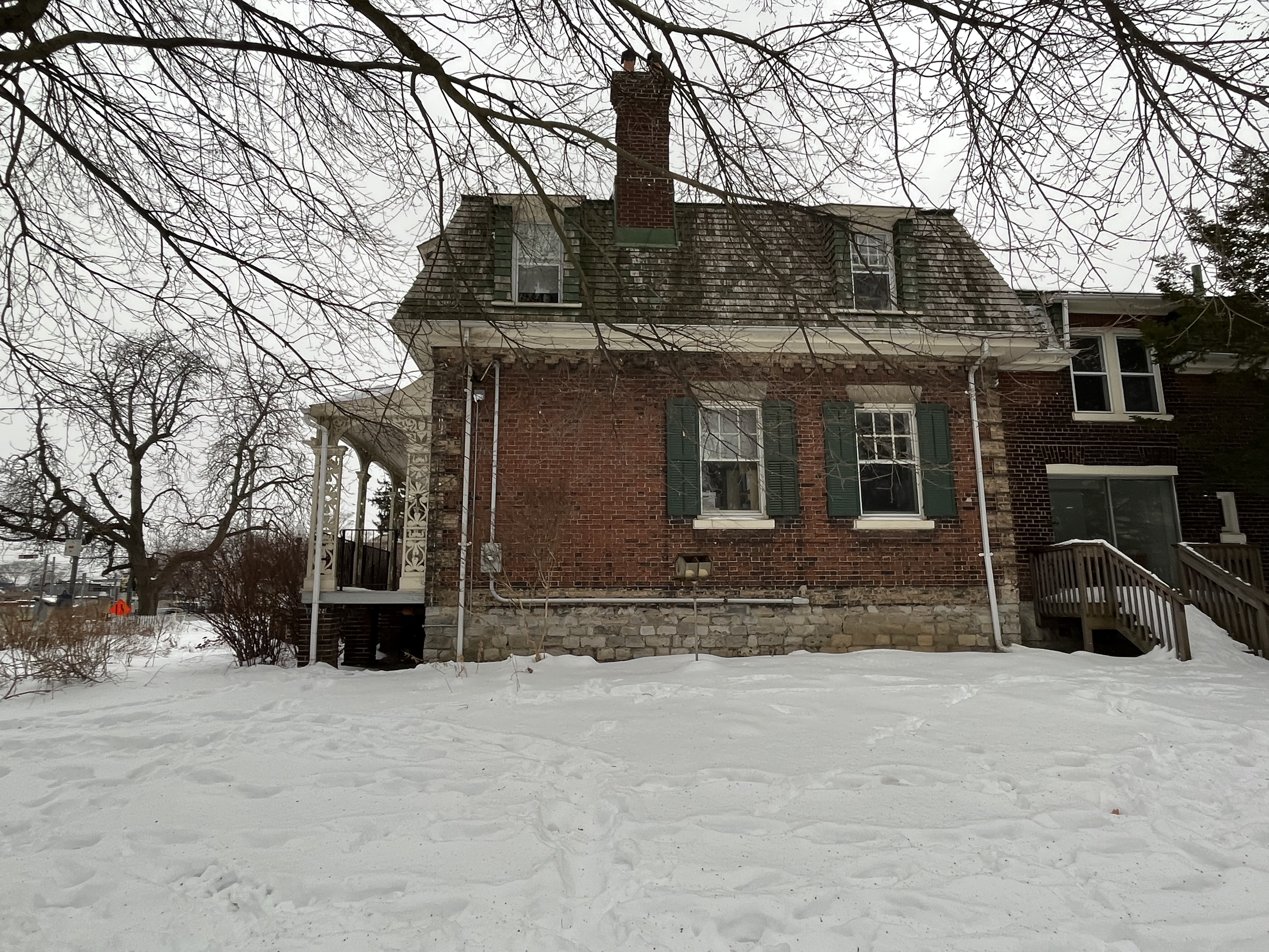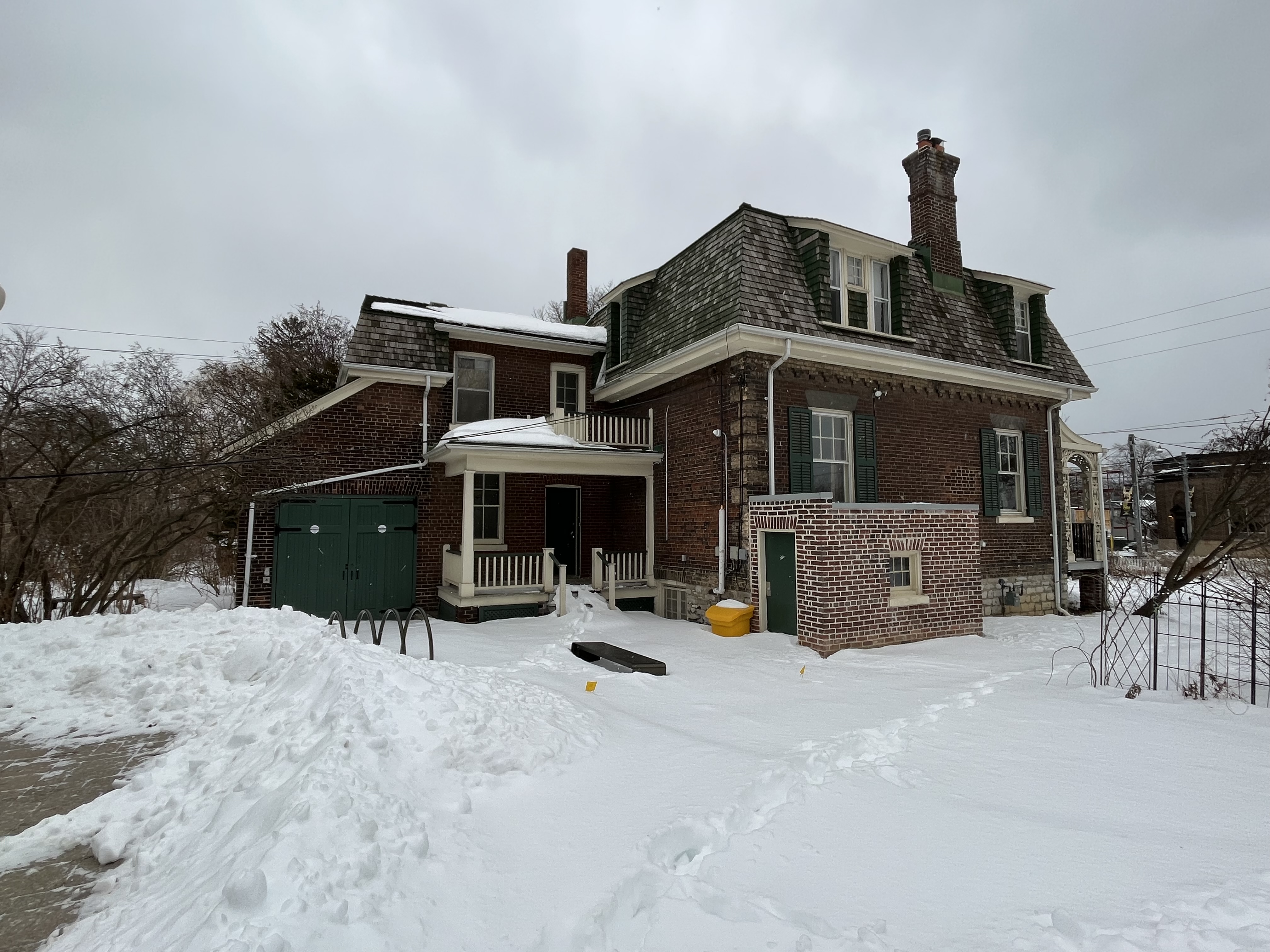 The side view shows the six over one double-hung sash windows that have been on the original house since it was built. The bricks were from a local brickyard and when the second floor was added the problem of matching brick colour was avoided by adopting a Second Empire mansard roof.