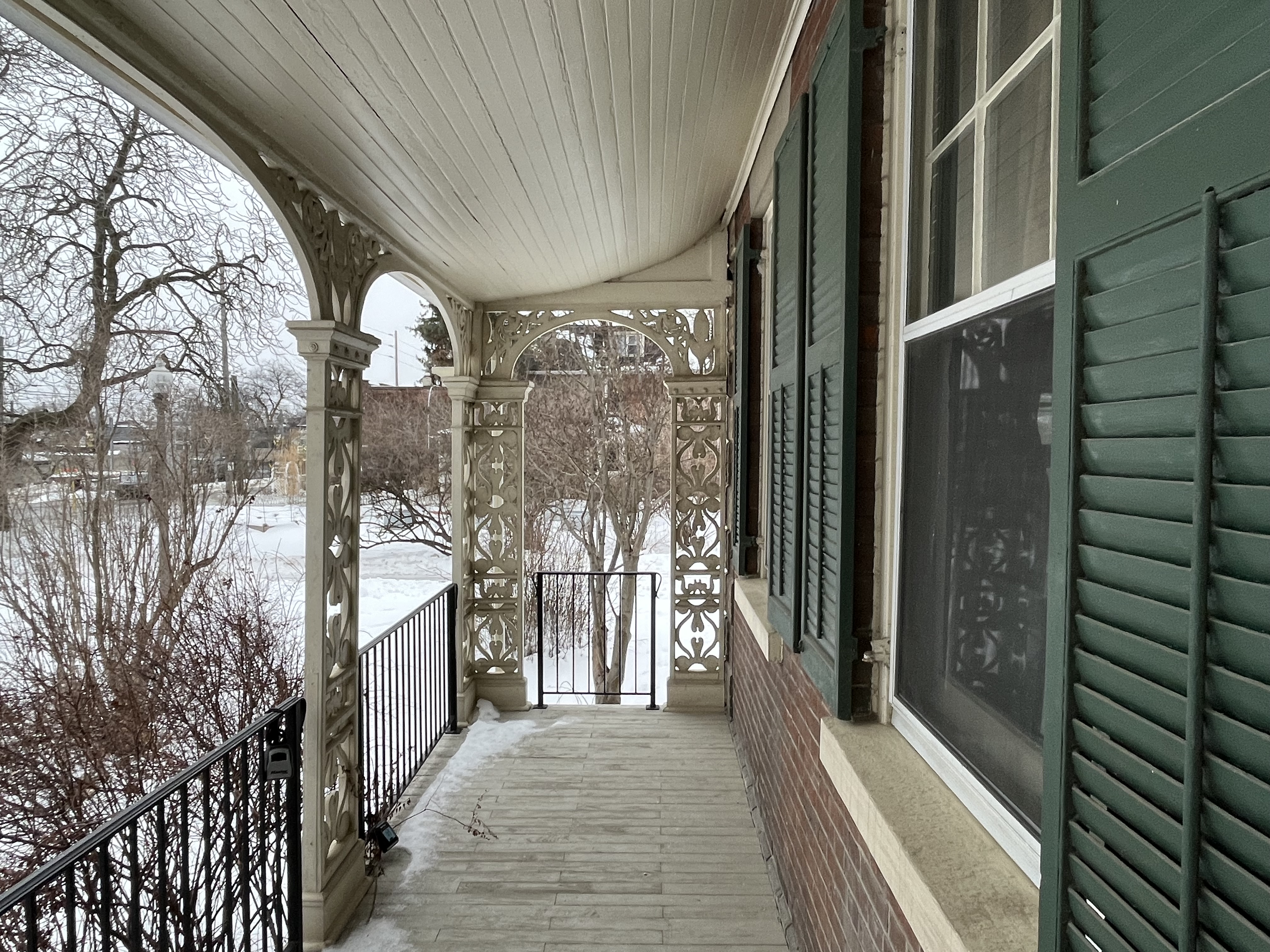 Inside the veranda you can really see the bell shape that the roof has. You also notice how badly the floor boards have warped and are starting to deteriorate. The house remained in the Ashbridge family until 1972 when it was donated to the Ontario Heritage Foundation. Dorothy Ashbridge continued to live here until 1997.