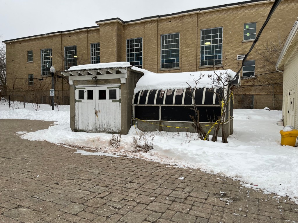 A small potting shed and a greenhouse stand behind the house as a reminder of the fabulous gardens that previousy surrounded the estate.