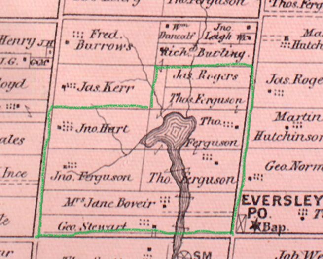 Eaton Hall has been referred to as Canada’s answer to Downton Abbey and is close as we come to Canadian royalty. The 700-acre property has a history that goes back to First Nations who camped around the lake and made use of the nearby Carrying Place Trail. The Toronto Purchase in 1787 allowed King township to be surveyed and opened to farmers in the 1820s. Some of the earliest in the area of Eversley was the Ferguson family who had a kettle lake on their section of the Oak Ridges Morraine. The 1878 County Atlas below shows the eventual site of Eaton Hall Farm.