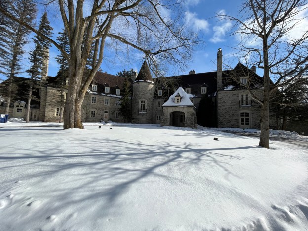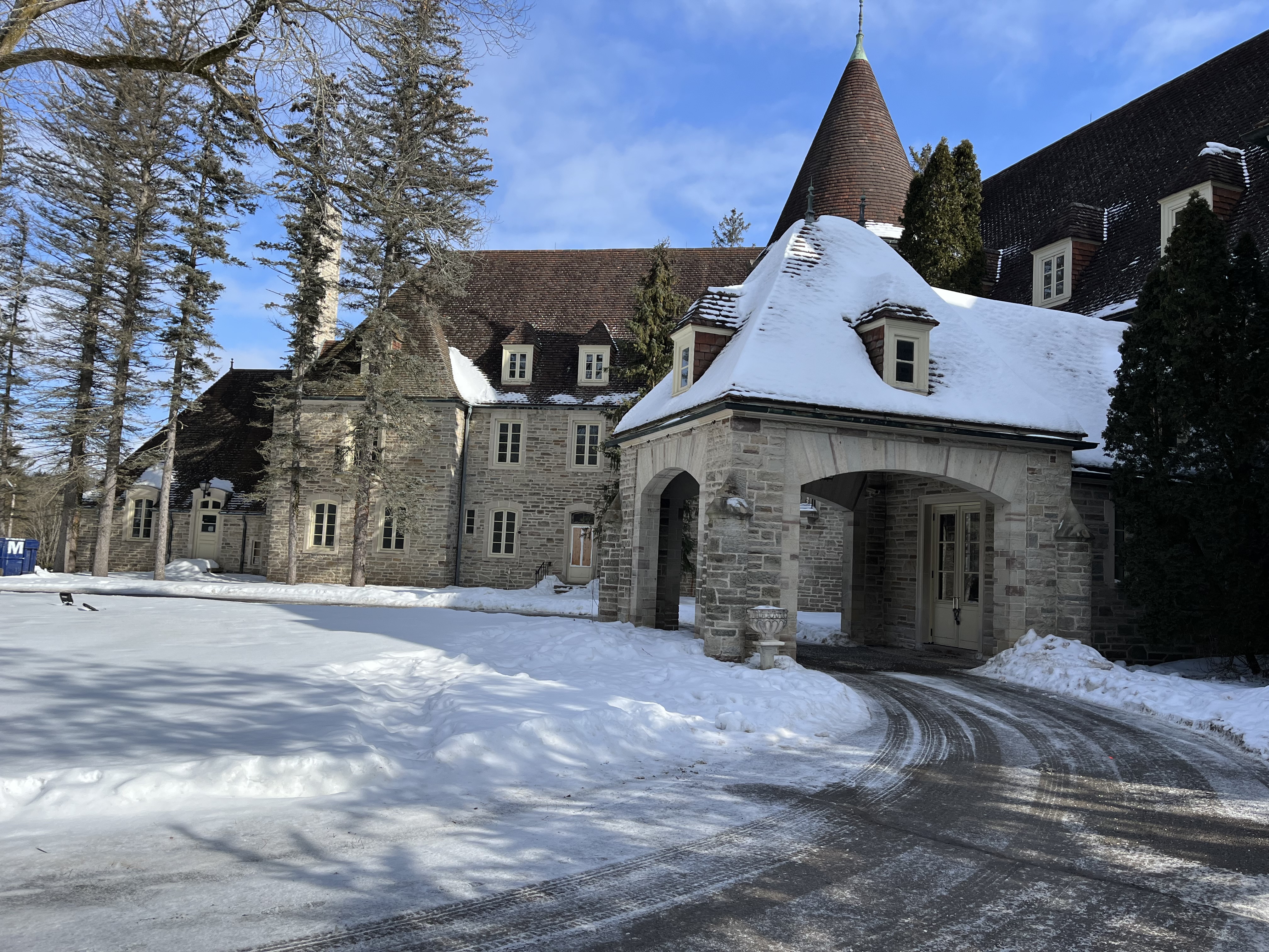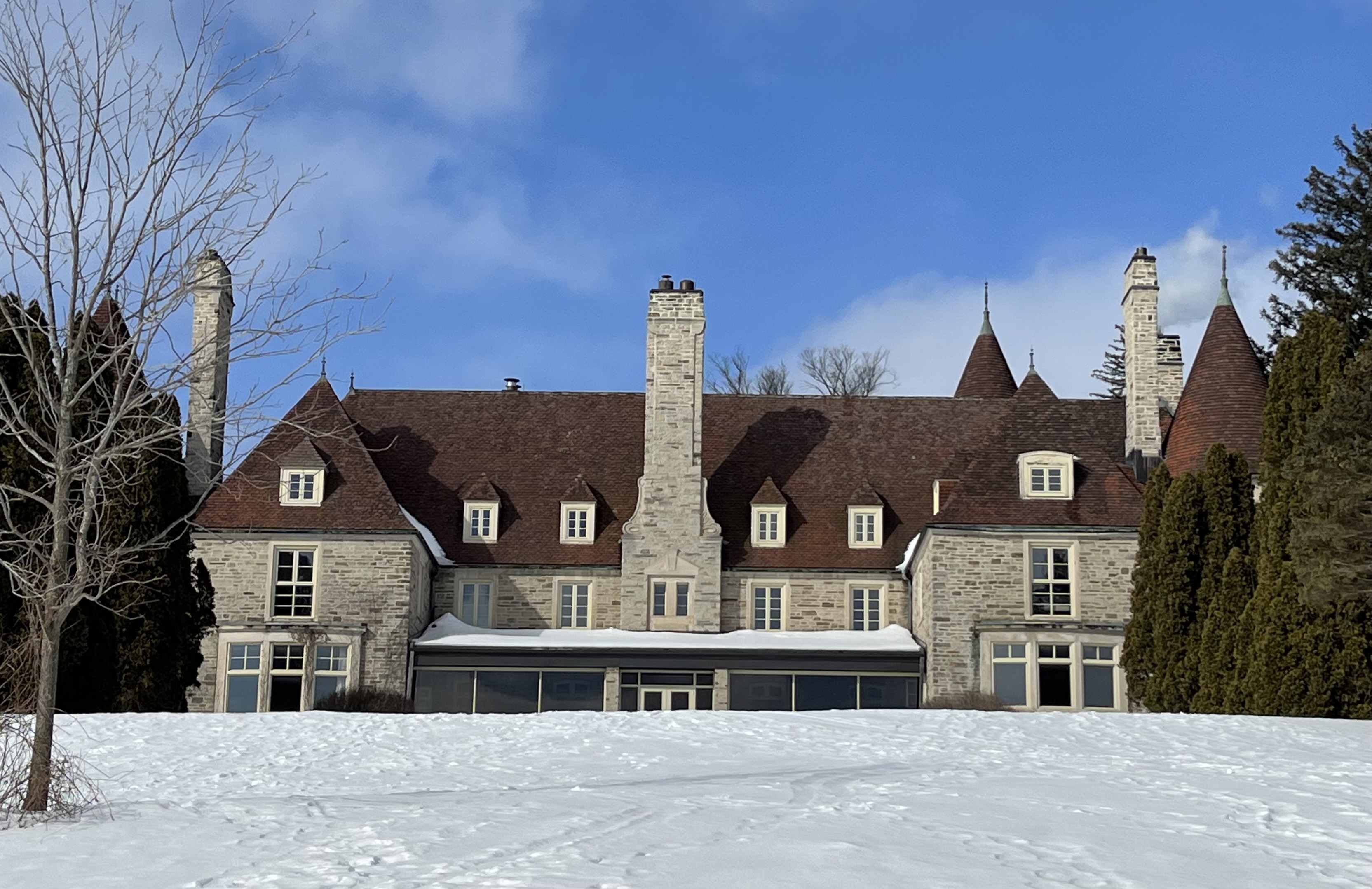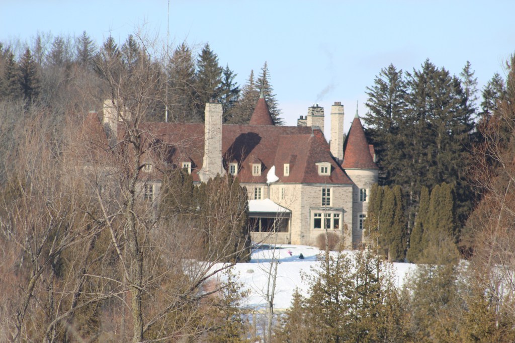 Plans for a family mansion that could host the children, grandchildren, and royalty we set in place in 1921. When John died they were put on hold until 1930 while Flora spent much of her time in Europe with her children. Construction began in January 1938 and finishing touches were completed by February of 1941. Looking like a castle, the 35,000 square foot home cost $380,531.13 which is about $6 million in today’s currency. It is made from local Humber River limestone which is appropriate since the lake in front of the castle is one of the primary headwaters for the river. It has two round turrets and one square one. The large round turret in the front of the home contains the grand staircase which only reaches the first three floors and does not continue to the servant’s levels above.