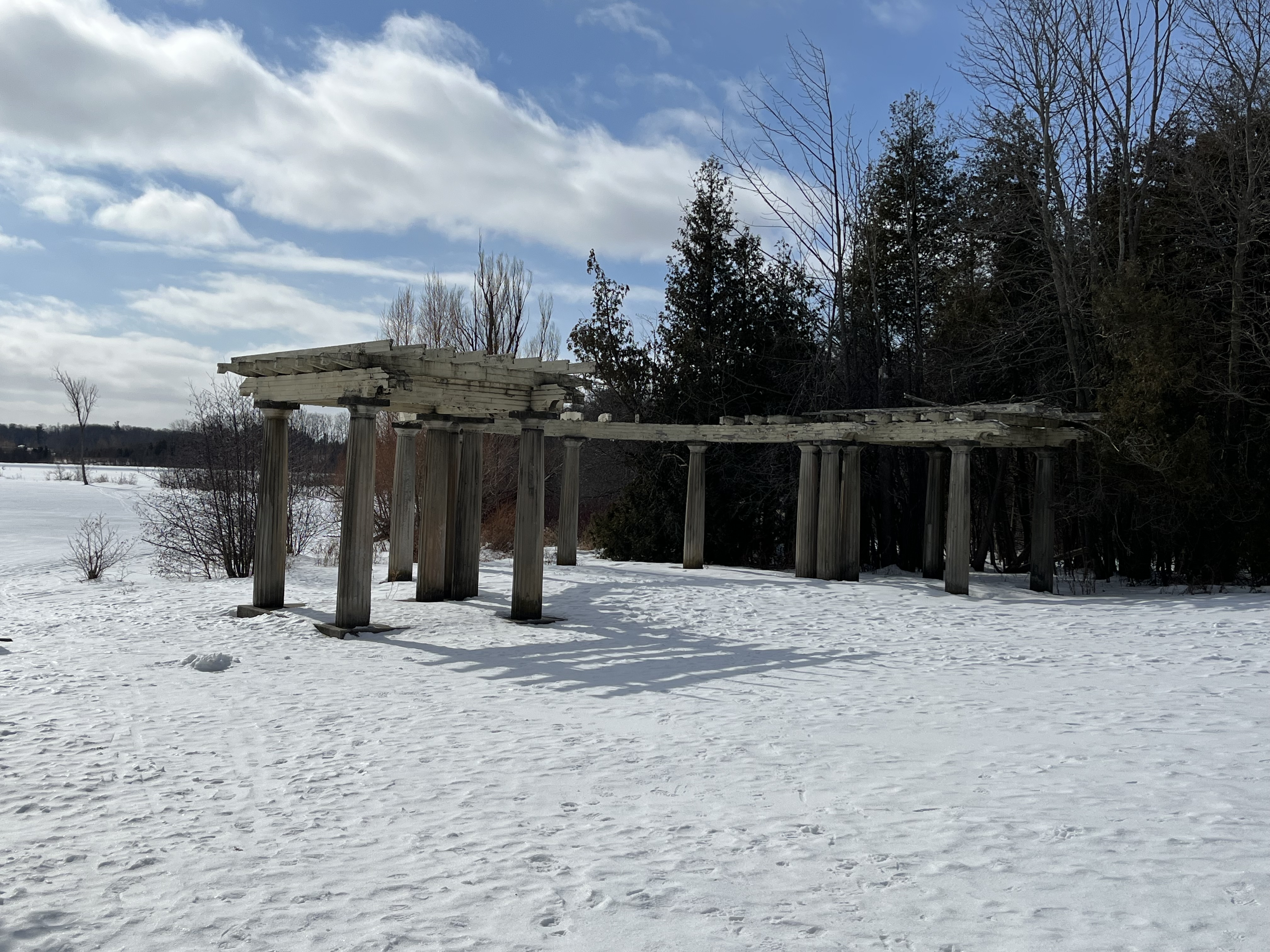 When Lady Eaton moved out of Ardwold, their city home, she determined that there was no market for it and had it destroyed. A few items were brought to Eaton Hall including the fireplaces, some carved stone benches, and the pergola. Although they still allow light to get through, the idea of a pergola is to provide a level of shade. After Flora Eaton died on July 9, 1970, the family agreed to sell the 696-acre property. Seneca College bought it to create their King Campus. At the time, there were 19 buildings on the site and nine families plus five other workers lived in the complex. A total of 27 people were employed to keep the farm and buildings in order. Seneca cut this back to four people and building maintenance wasn’t kept up. As a result, many of the buildings are in poor shape and the boathouse has recently been demolished. The pergola, Villa Fiori, and the workers’ homes are all in a state of deterioration. All of the buildings on the western end of the property are now in ruins.