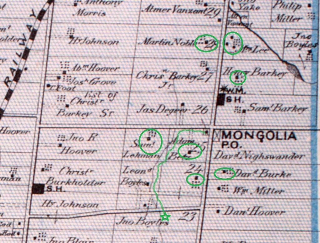 Mongolia was a community that grew around the modern intersection of Elgin Mills Road and Reesor Road. Peter De Guere arrived in 1801 and took the north west corner on lot 26. The adjoining lots were soon taken up as people cleared land for farming. As the community grew it got a tavern in 1841 and took on the name California Corners. It was never more than a farming community with a school, Methodist Church, and a Temperance Hall beside the blacksmiths shop. The rural atmosphere was lost in 1972 when the federal government decided that the flat land north of Pickering would make a good site for a future airport. They expropriated the entire town and then never built the airport. Studies show it won’t ever be needed and slowly the government is giving sections of the airport lands to help create Rouge National Urban Park. This is a far better use for the land, although it could still be productive farm land again. To explore and record what remains before it is lost we parked at the trail parking lot on the south east corner of the intersection. From there you can walk up or down Reesor Road to view the old homes or follow the trail to the historic Boyles Pioneer Cemetery. We did both. The 1877 county atlas section below shows many of the homes that still remain as well as the trail to the cemetery, which is marked with a star.