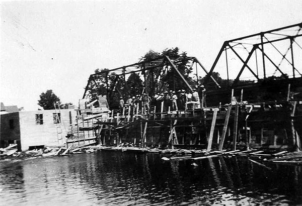 A fire broke out in the feed mill in 1944 which destroyed the building. The mill and the dam were both rebuilt with the feed mill getting a small grain elevator. The archive photo below shows the work crew standing on the old iron truss bridge that was built in the 1920s. Framing is in place for the dam and the foundations for the replacement mill are seen on the left of the picture.
