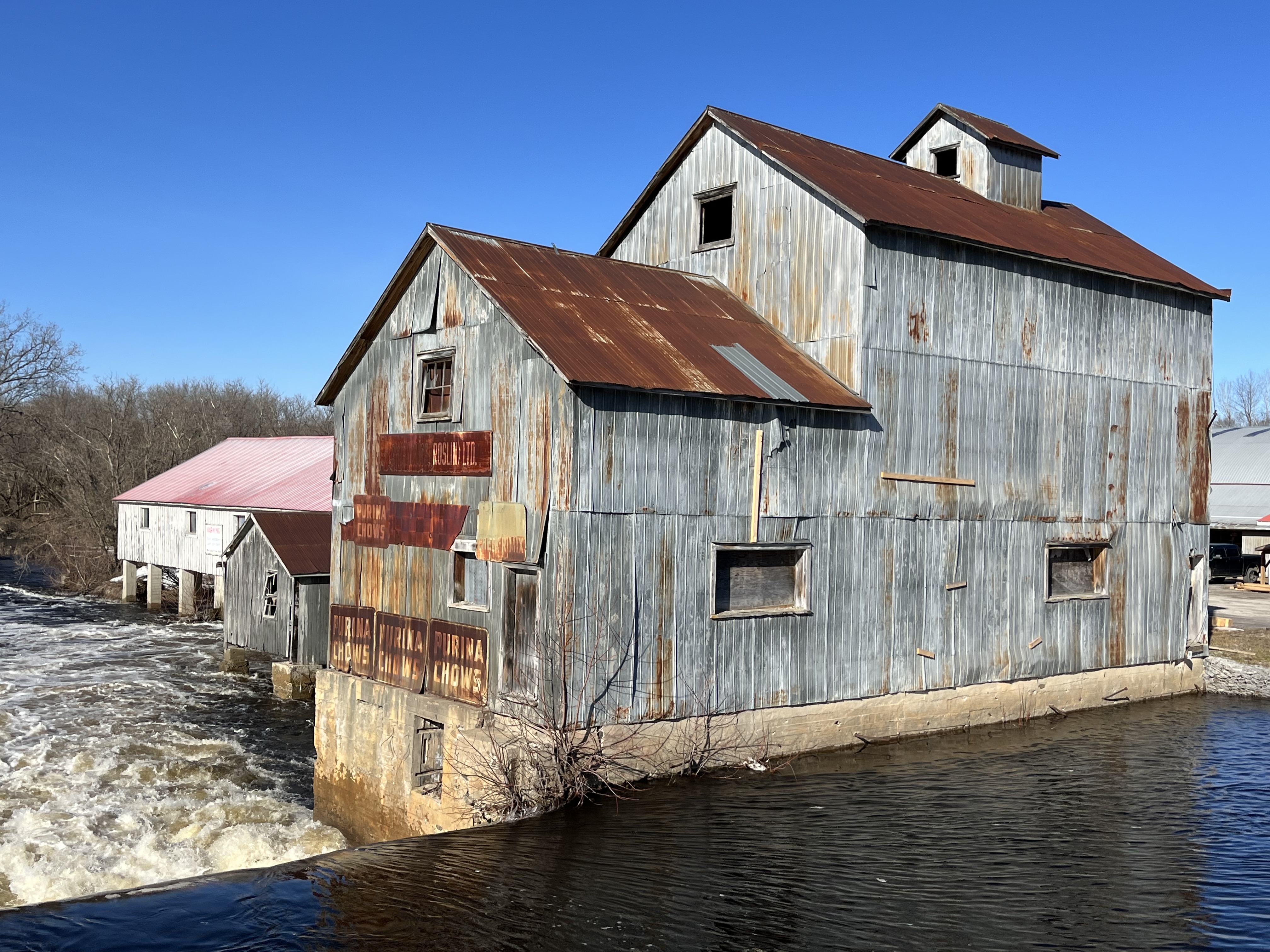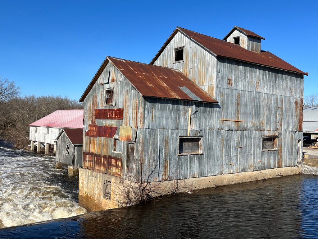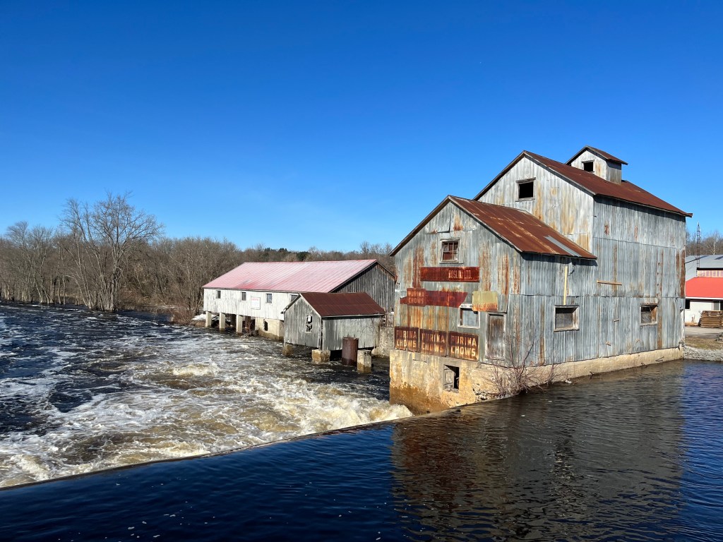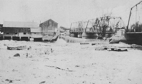 The dam and the bridge have each been upgraded several times. The first dam would have been made of an earthen berm and a wooden crib. The crib would have stretched across the river and been filled with rocks and would have needed repairs annually. Some time after 1900 the dam was replaced with a concrete one that requires much less maintenance and repairs. Earlier bridges were replaced with an iron bowstring arch bridge around 1900. A steel truss bridge was built in the 1920s which lasted for about 60 years. In the 1980s a concrete bridge was constructed and it continues to serve the mill and community. The picture below shows how the walls of the feed mill form part of the dam structure.