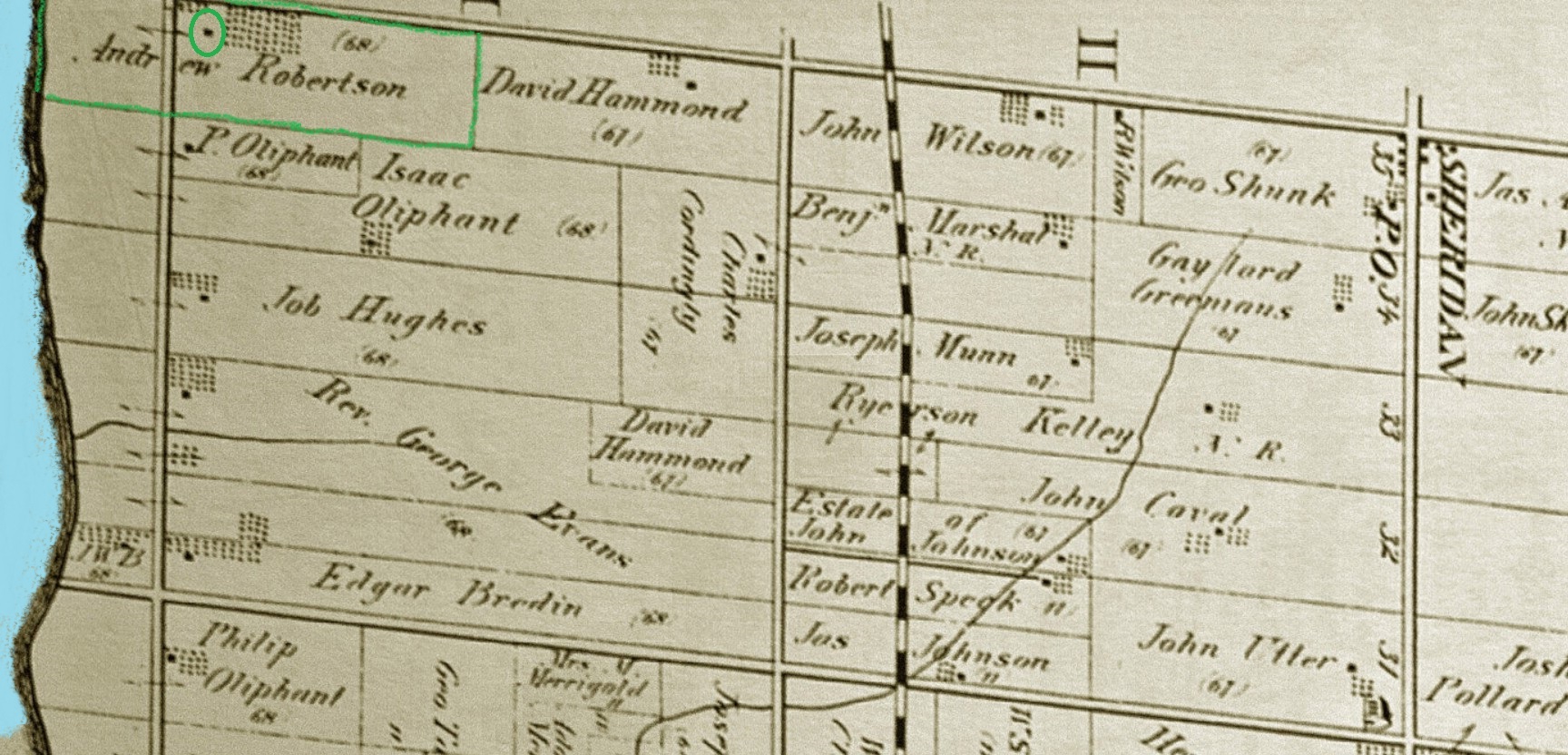 On the western corner of Mississauga stands a 171 year-old historical home that is working on becoming history. The house is located on the south half of lot 35 concession 3 in South Toronto Township which is now part of Mississauga. The lot was deeded to Henry Grant in 1808 when he met the land grant responsibilities and gained ownership of the 200 acre lot. It has a broken front, which means that it borders on the lake and there is not a straight line along the southern side of the lot. In 1851 the lot was split and sold in two halves. David Hammond had the northern section while Andrew Robertson bought the south portion including the lake frontage. The lot can be seen on the 1877 County Atlas below where it is outlined on green. The house we’re about to look at is circled in green.