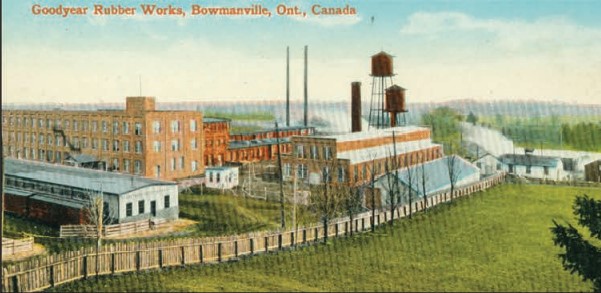 Charles Goodyear discovered the process for vulcanization of rubber in 1839. This process uses sulfur to harden natural rubber into various products. As the automotive age was dawning, a company was founded in Akron, Ohio in 1898 which was called The Goodyear Tire & Rubber Company. By 1907 they had a contract with Henry Ford to provide tires for the Model T. In 1910 they bought a rubber company in Bowmanville and expanded their manufacturing outside of the United States for the first time. The old postcard image below shows the plant in its early days.