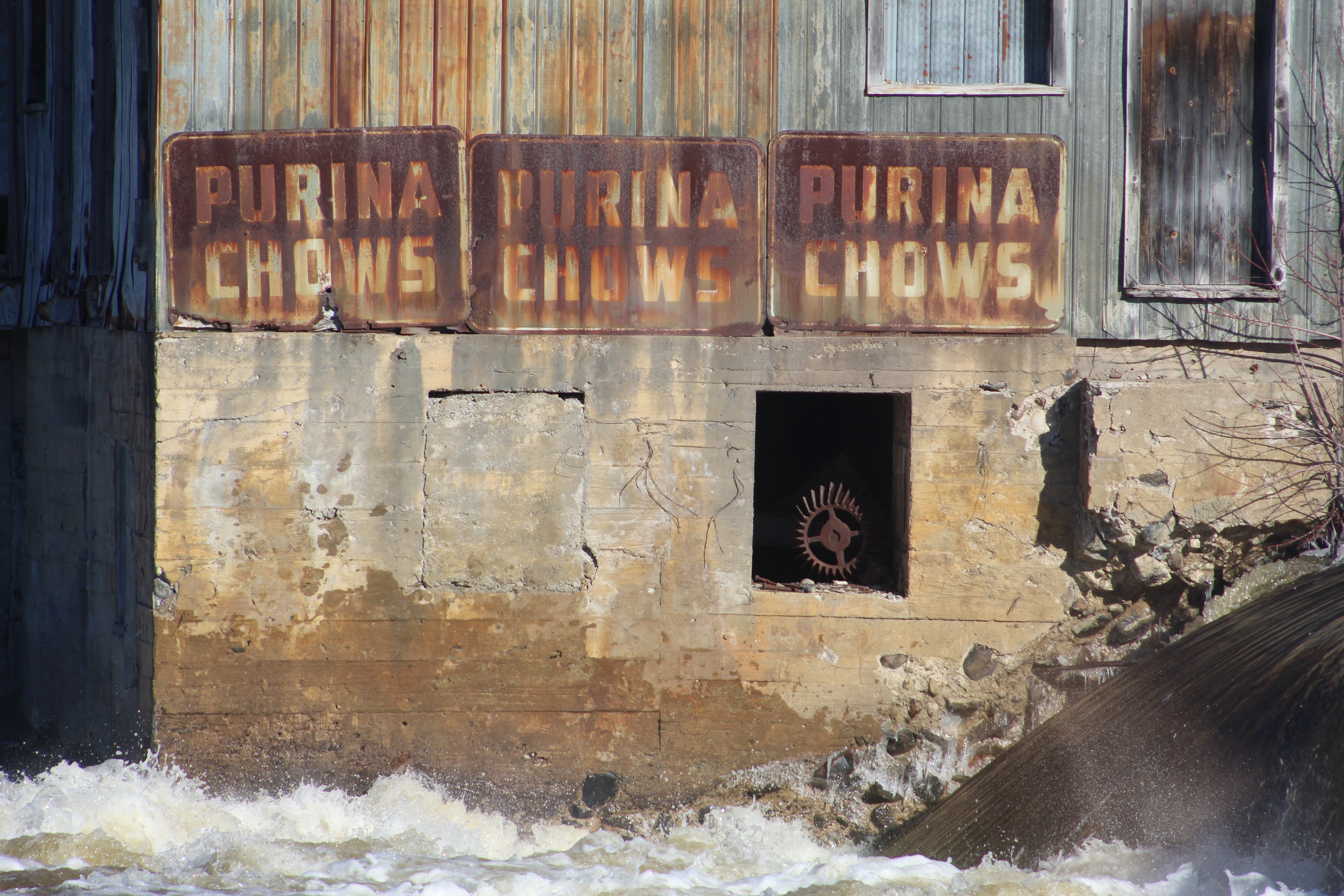 A series of old metal signs on the side of the building have been preserved as a record of the history of grinding and blending feed for the use of the local farming community. The Chisholm family has preserved the inner workings of the mill and part of the turbine system can be seen through the opening in the wall. The concrete wall of the building is showing the results of nearly 80 years of water and ice damage.