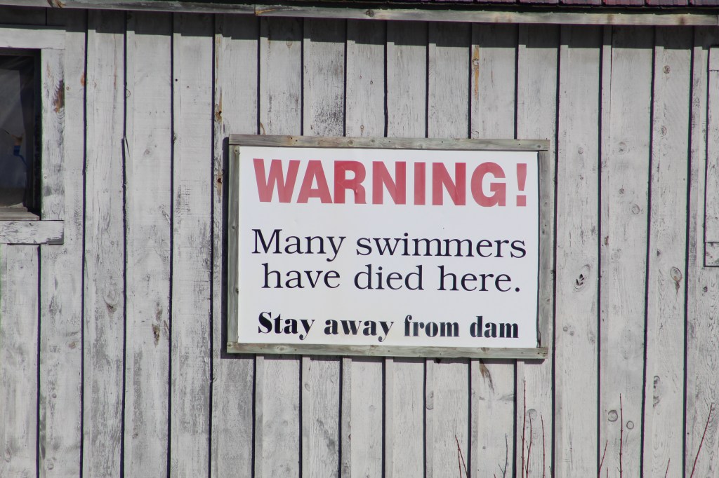There is another sign on the building, this one warning swimmers to stay away. I notice that it has been moved since 2017 and it can be seen on the side of the mill in the archive picture above where the mill pond is drained. It is actually no longer beside the dam but the message is just as important.