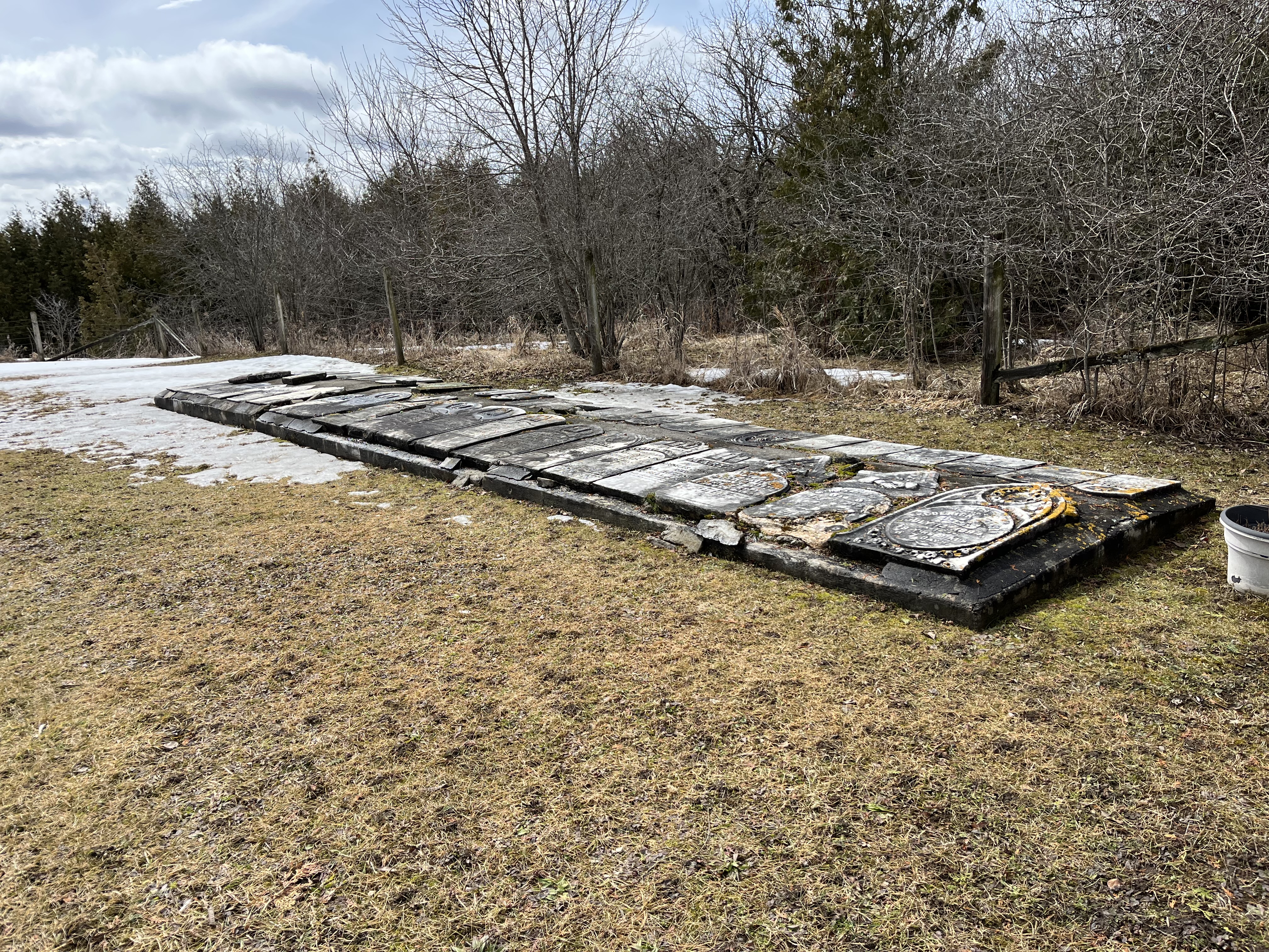 The Methodist church stood north of the main intersection but its burial grounds were on the property of John Boyles. Located on a small plateau overlooking the river, it stands about 400 meters from the road. The stones have been gathered up and placed into an unusual ground level cairn with the stones lying flat. They may be more subject to the weather than they would be in a more common vertical presentation. There are at least 47 burials commemorated in this cairn and one additional one from 2002 that has a grave marker beside it. Please note that the trail ends before the cemetery and it is not part of the trail. If you choose to visit, please do so respectfully.