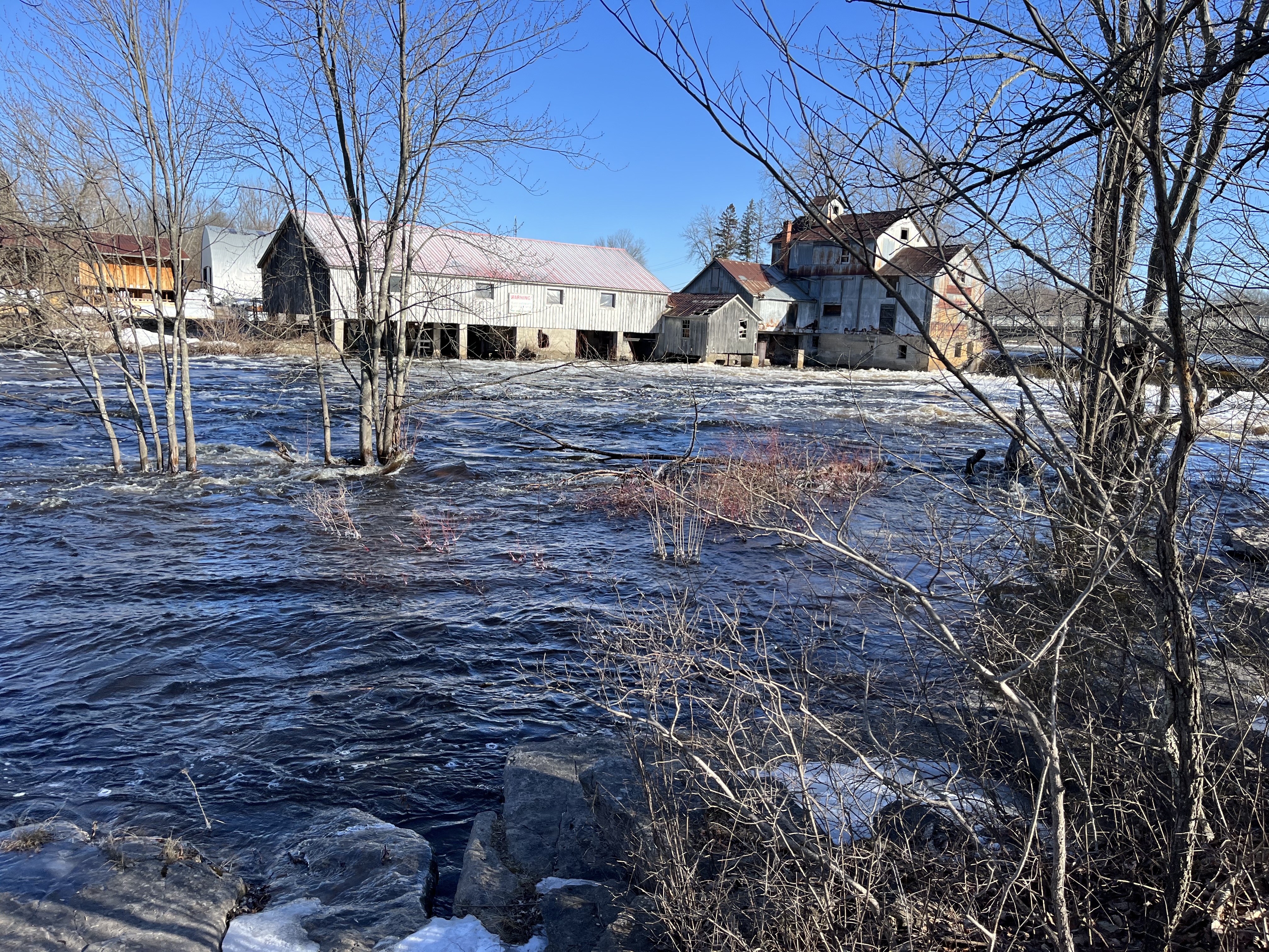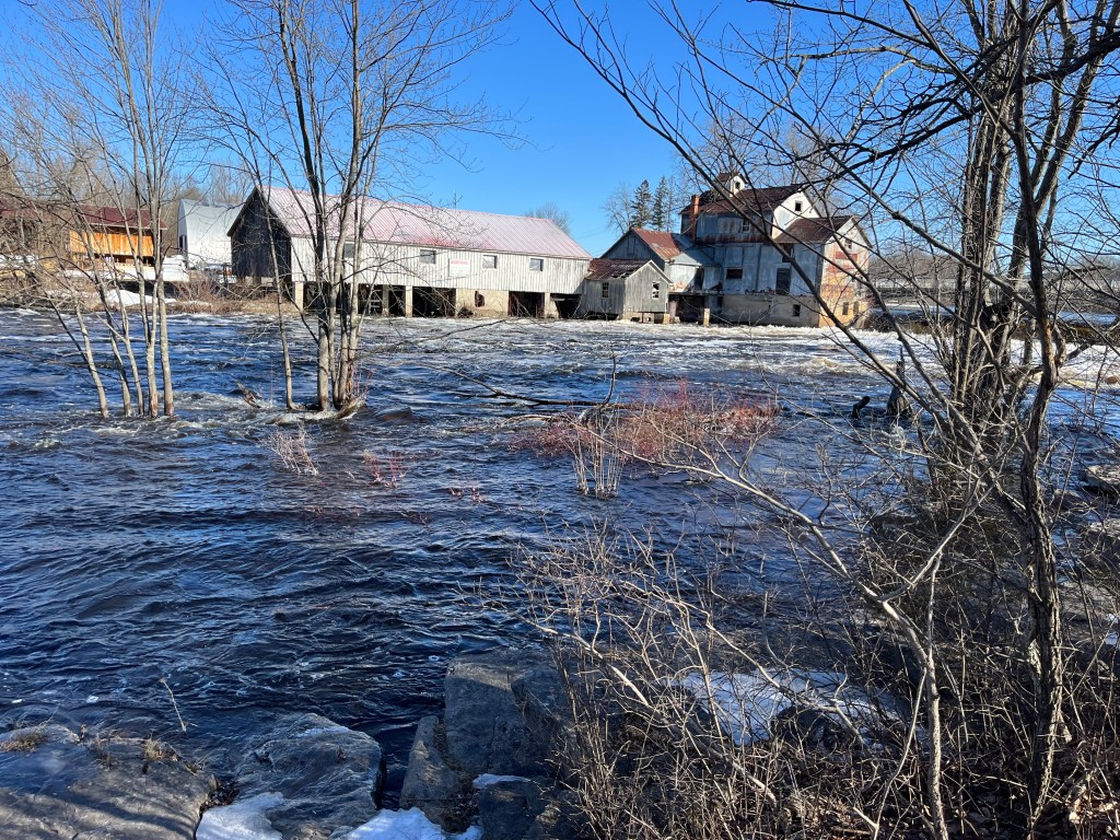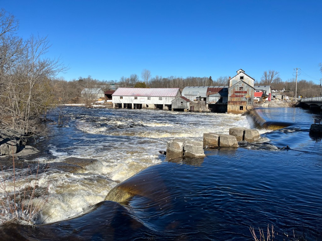The original mills on the Moira River in Roslin were known as Shipman’s Flour and Saw Mill and were purchased in 1857 by William Fraser Chisholm. They have been in operation ever since and carry on today as Chisholm Lumber. The archive picture below was likely taken in the 1920s or 1930s based on the fact that the old truss bridge is in still place and the original frame mill buildings are present.