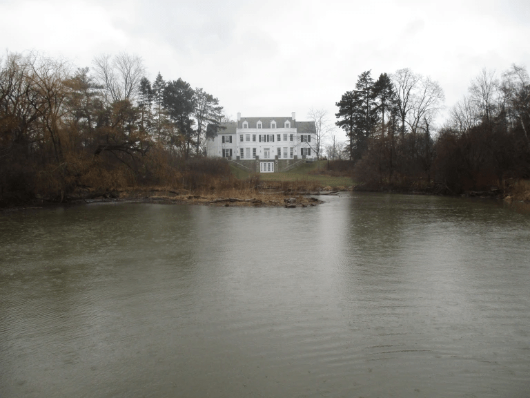 Apartment buildings surround the mansion and its gardens.
