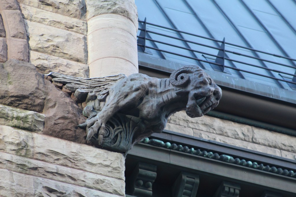 The original gargoyles on the clock tower were in poor shape by 1938 and so they were removed to eliminate the risk that they would fall and injure someone. New ones were fashioned out of bronze in 2002 and installed on the tower bringing back some of its former glory.