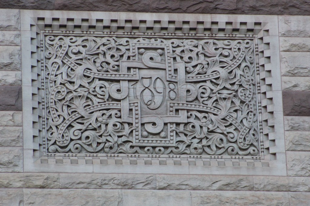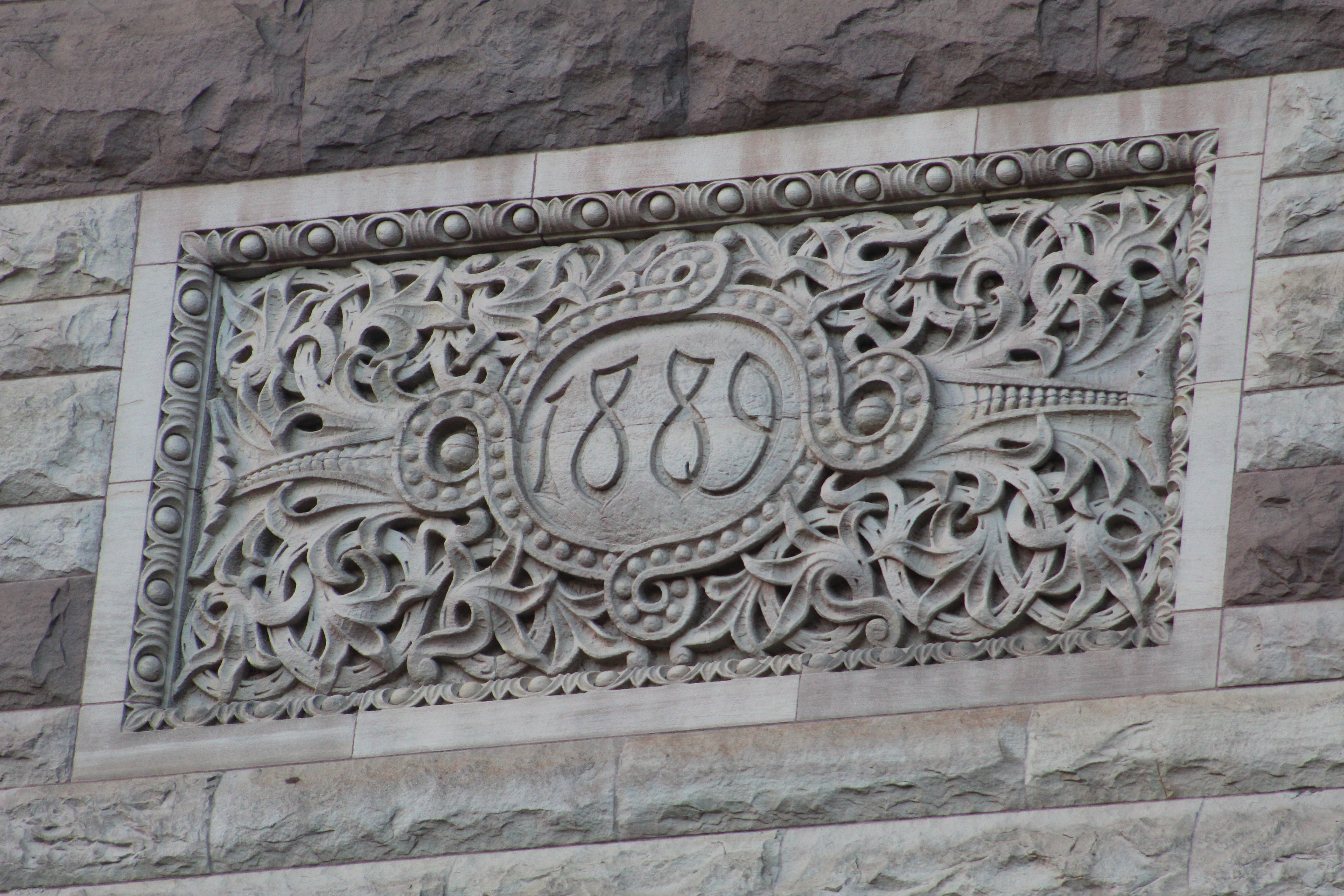 The east side of the building was identified as City Hall and the lettering can be seen among the finely carved sandstone above the doorway.