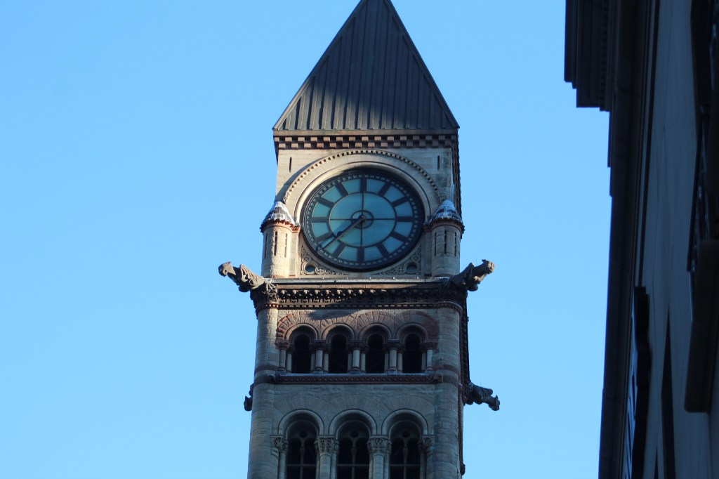 The building was constructed in the Richardsonian Romanesque Revival style which was popular for large public buildings in that era. The dominant feature of the building is the 104 metre tall clock tower. It was placed off centre so that it would be seen as central by those looking up Bay Street.
