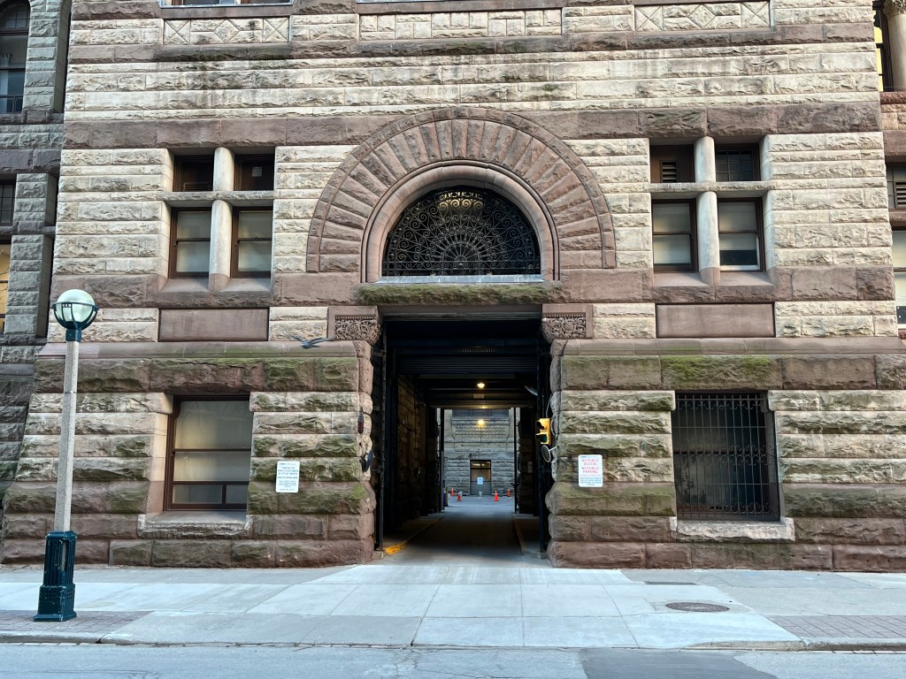 The building shape is known as a quadrangle and it has an inner courtyard. In its present use as a courthouse this is where the police vehicles enter with the people who are being charged with a crime and are facing the judge for trial or a bail hearing. The courtyard can be accessed from the inside of the building but is not open to casual pedestrians who merely wish to look around.