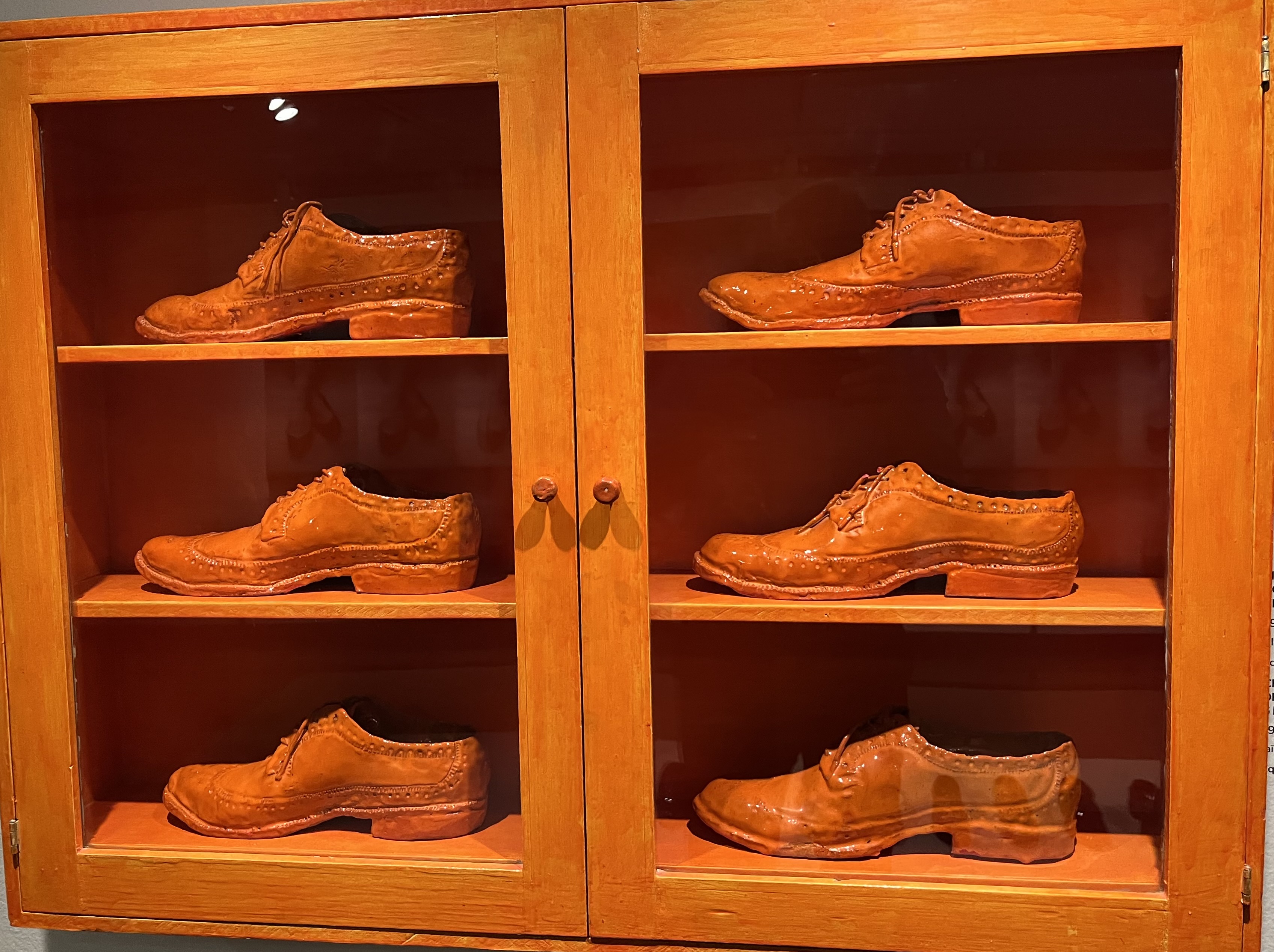 Gathie Falk was born in 1928 and is famous for her work with everyday items including fruit, Paper Mache dresses and picnics. One of the interesting displays at the gallery is her work with ceramics in creating shoes.