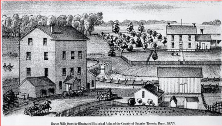 Altona was founded in the early 1800s by Mennonites of Swiss-German descent who had emigrated from Pennsylvania. They named their community after Altona in Germany, a town which is now part of Hamburg, Germany. It remained a small farming community until 1850 when Abraham Reesor built the first saw and grist mills in the area. Abraham was the son of Peter Reesor who was one of the early pioneers in the GTA. A school was built in 1834 and the community seemed to peak around 1856 at about 256 people. By 1869 the census showed only 200 residents and by 1910 it was down to only 100 people. This was often the fate of hamlets that were bypassed by the railways. The image below shows the Reesor mill as pictured in the 1877 County Atlas.