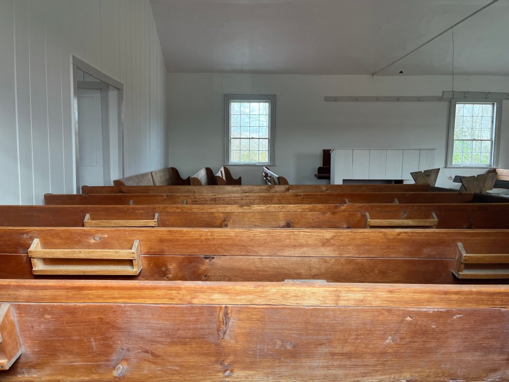 Through the window the simple pews can be seen as well as the pulpit. There is no ornamentation in the church and no stained glass in the windows. The Mennonites met here until September 15, 1974, after which regular services ceased.