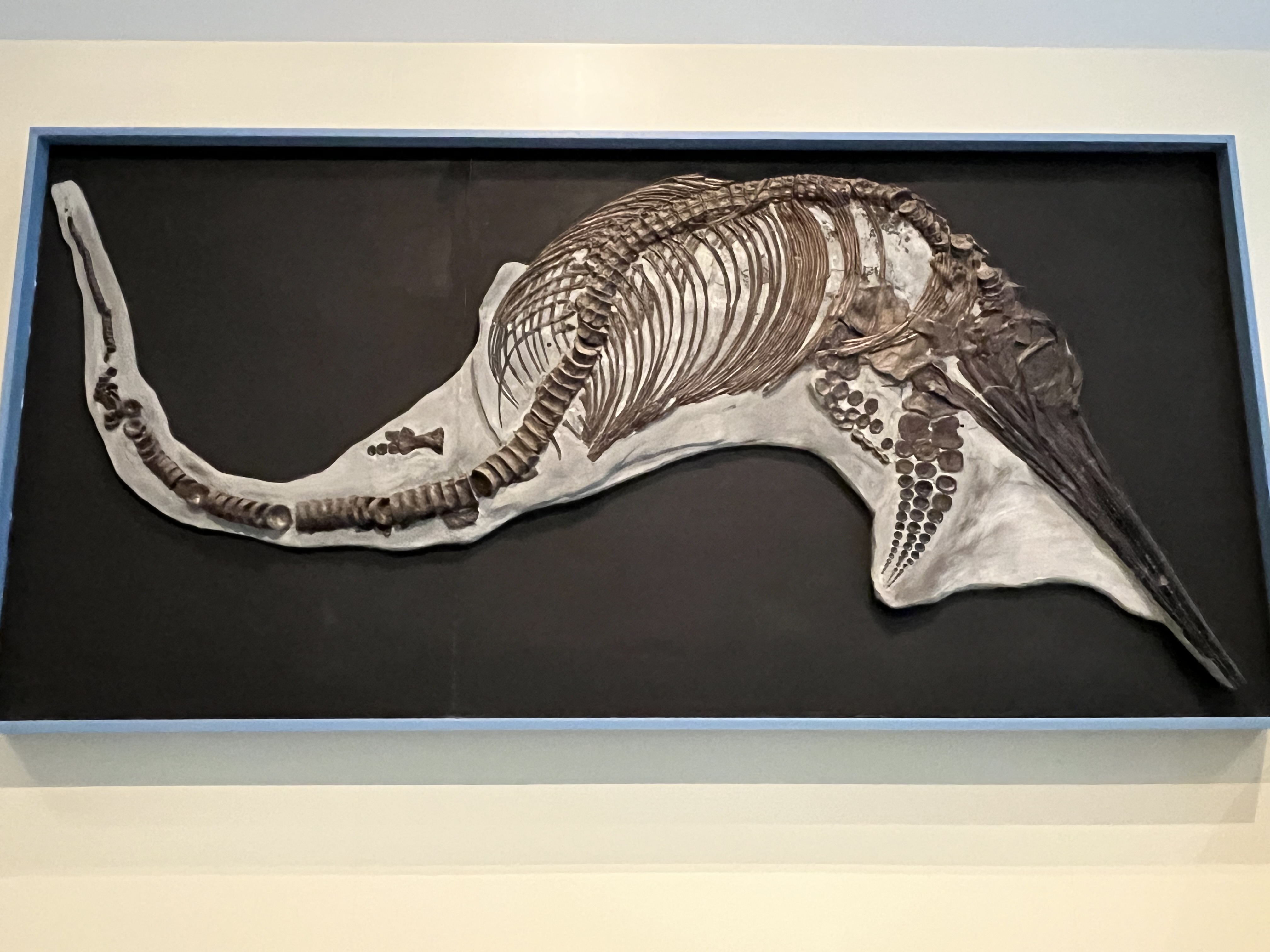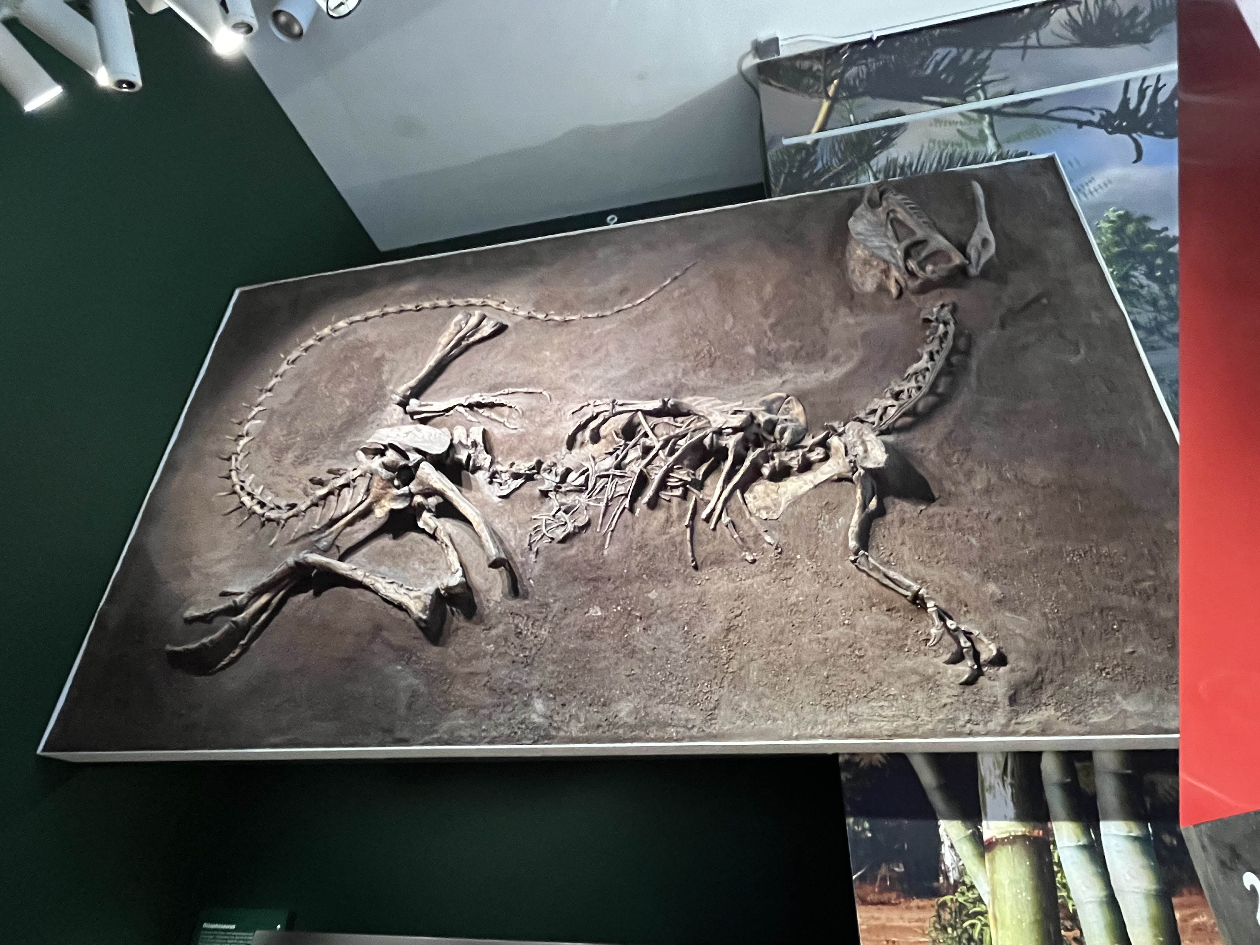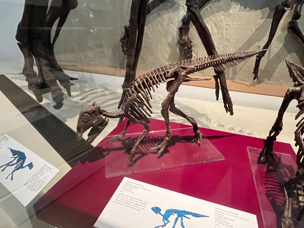We tend to be most familiar with the largest dinosaurs but of nearly 700 species identified most are actually quite small. And, of course, even the big dinosaurs were small when they first hatched. The image below shows the skeleton of a baby Maiasura, whose name means Good Mother in Greek. They were given this name because nests have been found which contained eggs and young animals. This told researchers that the mothers fed the infants in the nest. That was the first evidence of maternal activity in dinosaurs. The fossil below is of an infant which didn’t have the opportunity to grow to the full 9 metre length of an adult.