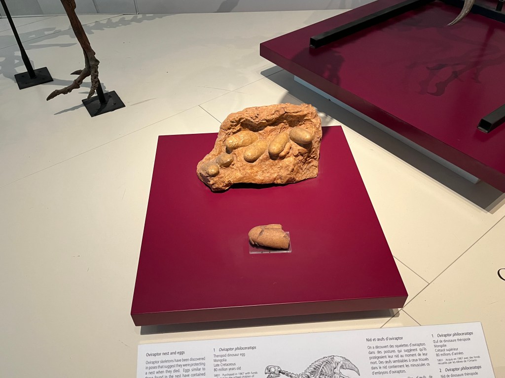 Dinosaurs laid eggs that were often protected by the mother while they were in the nest. In 2021 a fossil was discovered of a dinosaur that was buried while hunched over her nest of 24 eggs. At least seven of those eggs have preserved bones of the partially developed embryos. The museum has an example of dinosaur eggs on display.