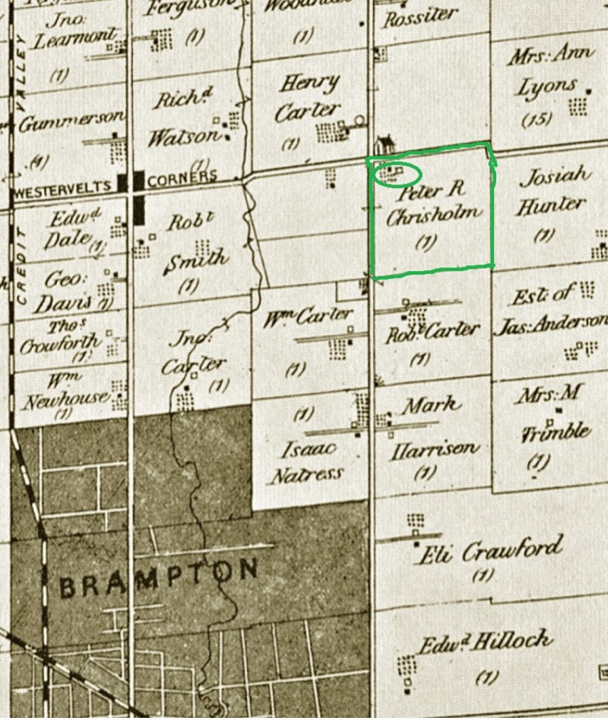 The 1878 map below shows the property under the ownership of Peter Renwick Chisholm. It is located at the intersection of the modern roads of Bovaird Drive and Kennedy Road and is formally known as the west half of lot 10 in the second concession east of Chinguacousy township.