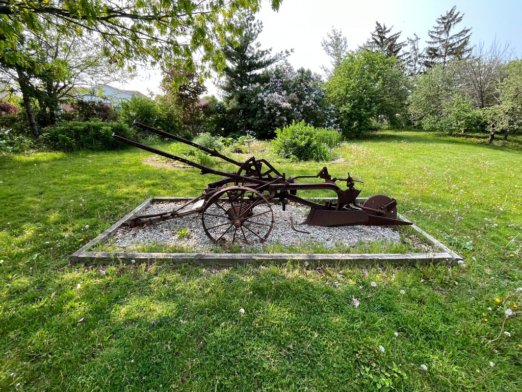 Behind the Bovaird house is an historic piece of farm equipment. It is known as a “brush breaker” and was one of the early implements built by Harvester International. It was used in the preliminary ploughing of fields to break up brush and shrubbery. They are built extra strong and designed for the hardest type of ploughing including cutting through hazel brush and blackberry bushes. A similar item appears in their 1927 catalogue. This implement was found on the Lundy Farm when it was being cleared for development and has been moved to Bovaird house to be part of the exhibit of early farming.
