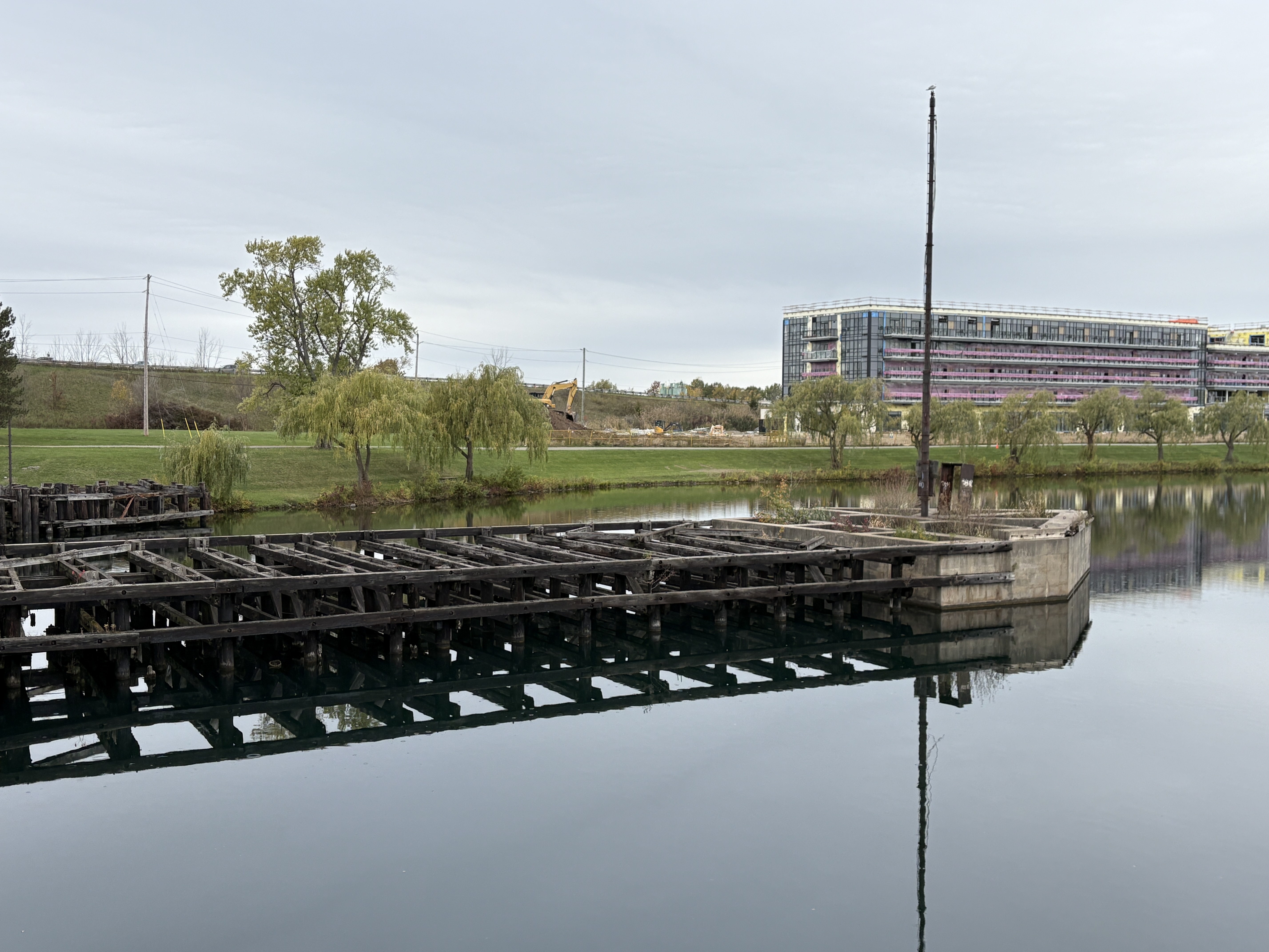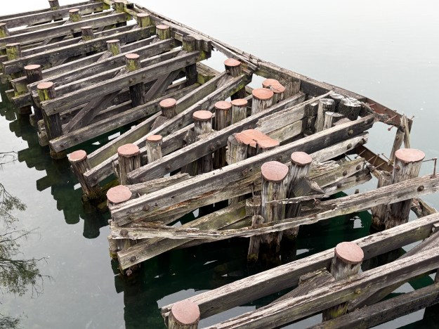 Piers were sunk into the river bed on either bank of the river to protect the bridge abutments from impacts with wayward ships. These are rotting and slowly falling back into the water.