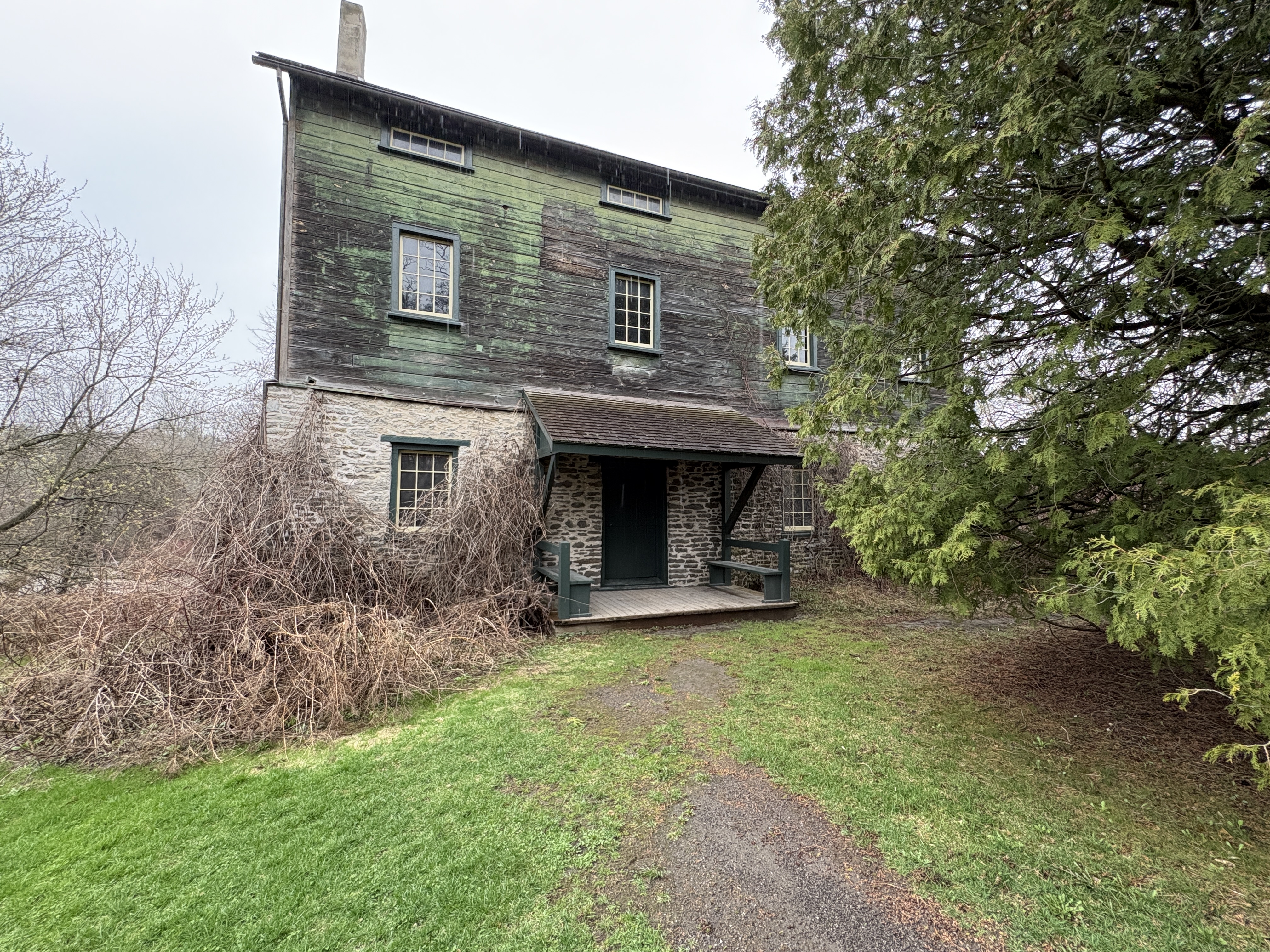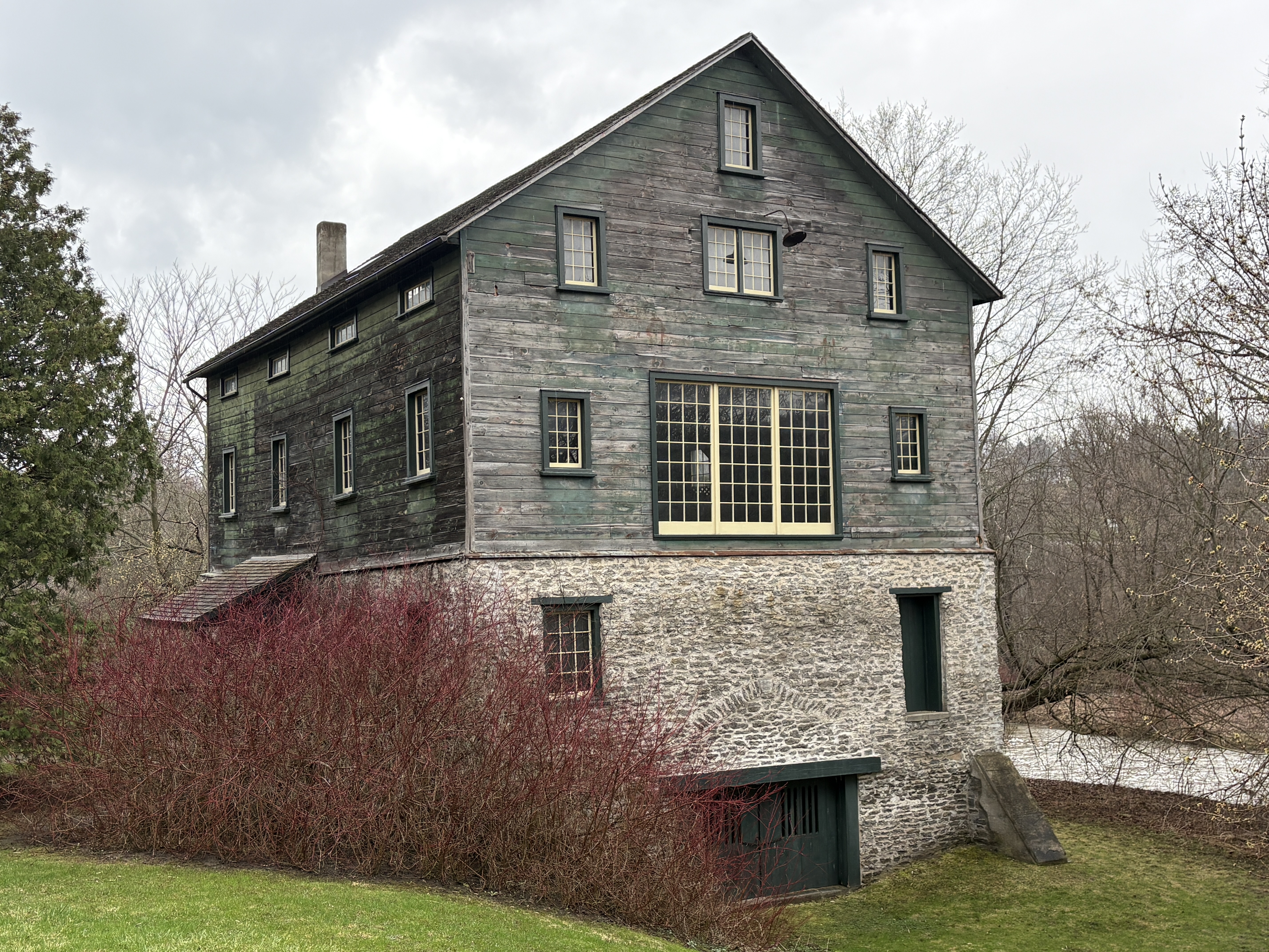 In 1851 Port Hope had the second largest harbour in Upper Canada and so Thomas set his sights on this community. He bought a mill site on the Ganaraska River about a mile upstream from the harbour. The grist mill is three and a half stories and is of post and beam construction. It stands on a foundation of river stones and has seen some alterations over the years, The large multi-paned window on the end was added in the 1920s.