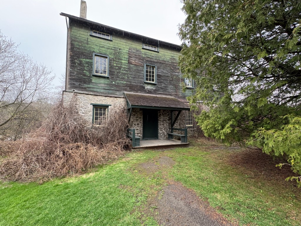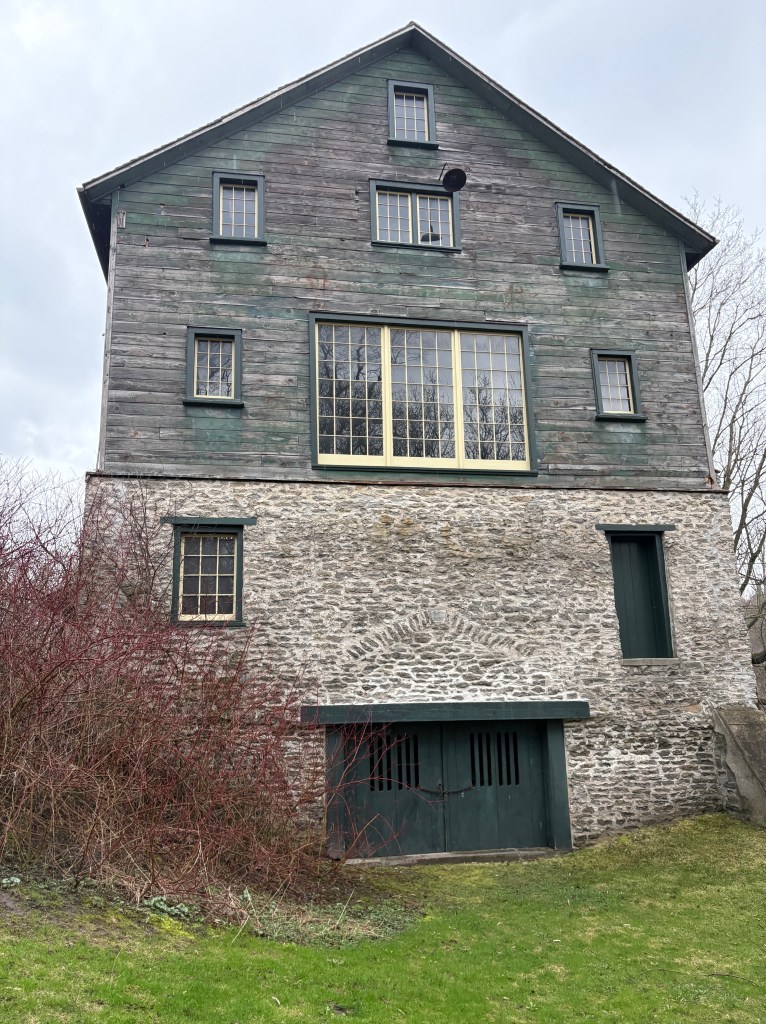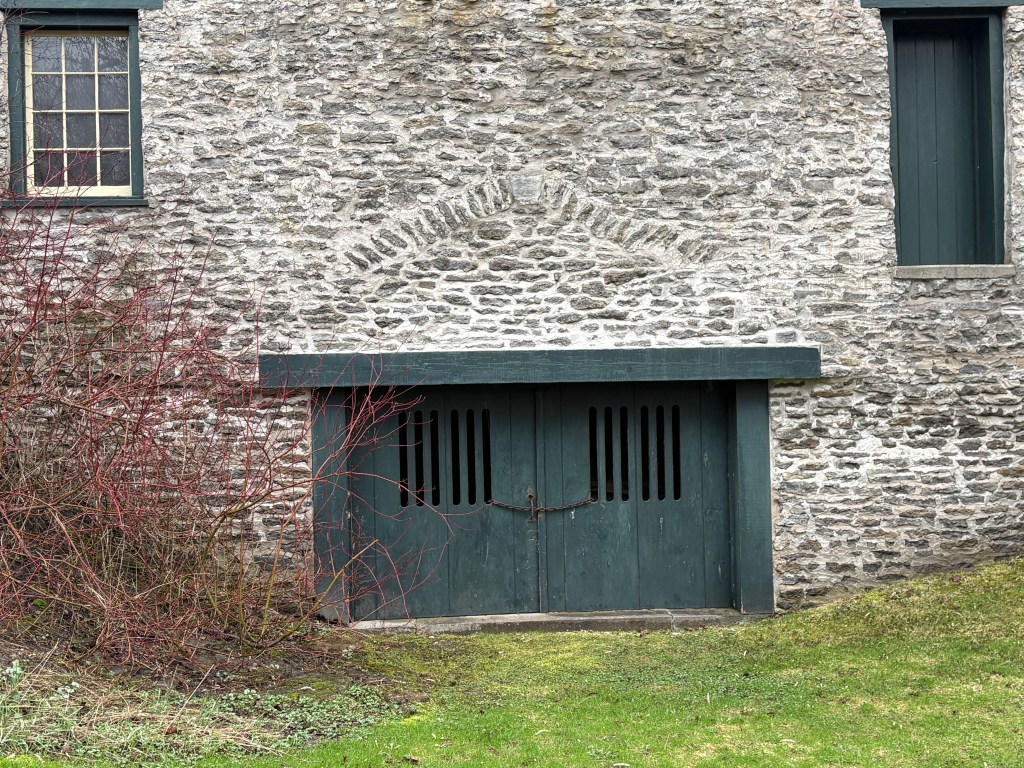 He paid 337 pounds for a property where he operated a small industrial empire. In addition to the grist mill there was a brewery and distillery. A saw mill produced staves for the barrels that were needed for the shipment of the flour they milled. The image below shows the alterations made to the large ground level doors to the building. The row of vertical stones above the door shows the outline of the previous opening.