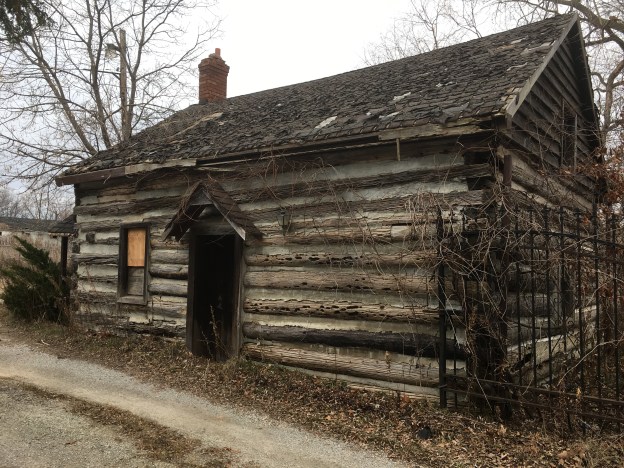 In 1835 George Ludlow and his wife Francis moved to Trafalgar and built this log cabin which stands at the end of Burnhamthorpe Road in Glenorchy. Francis gave birth to their six daughters in this three-room cabin. Similar to the first house on the Stong property (now Black Creek Pioneer Village) this house has two bedrooms and a living room where the cooking, weaving and dining would have been done. The end of the house with the chimney had this family room in it. The bedrooms are on the end of the house with no window. The cabin is known as the Ludlow/Slacer cabin because of Martha, the second oldest daughter, who lived here after she married John Slacer. The cabin is marked with a red arrow on the county atlas above.
