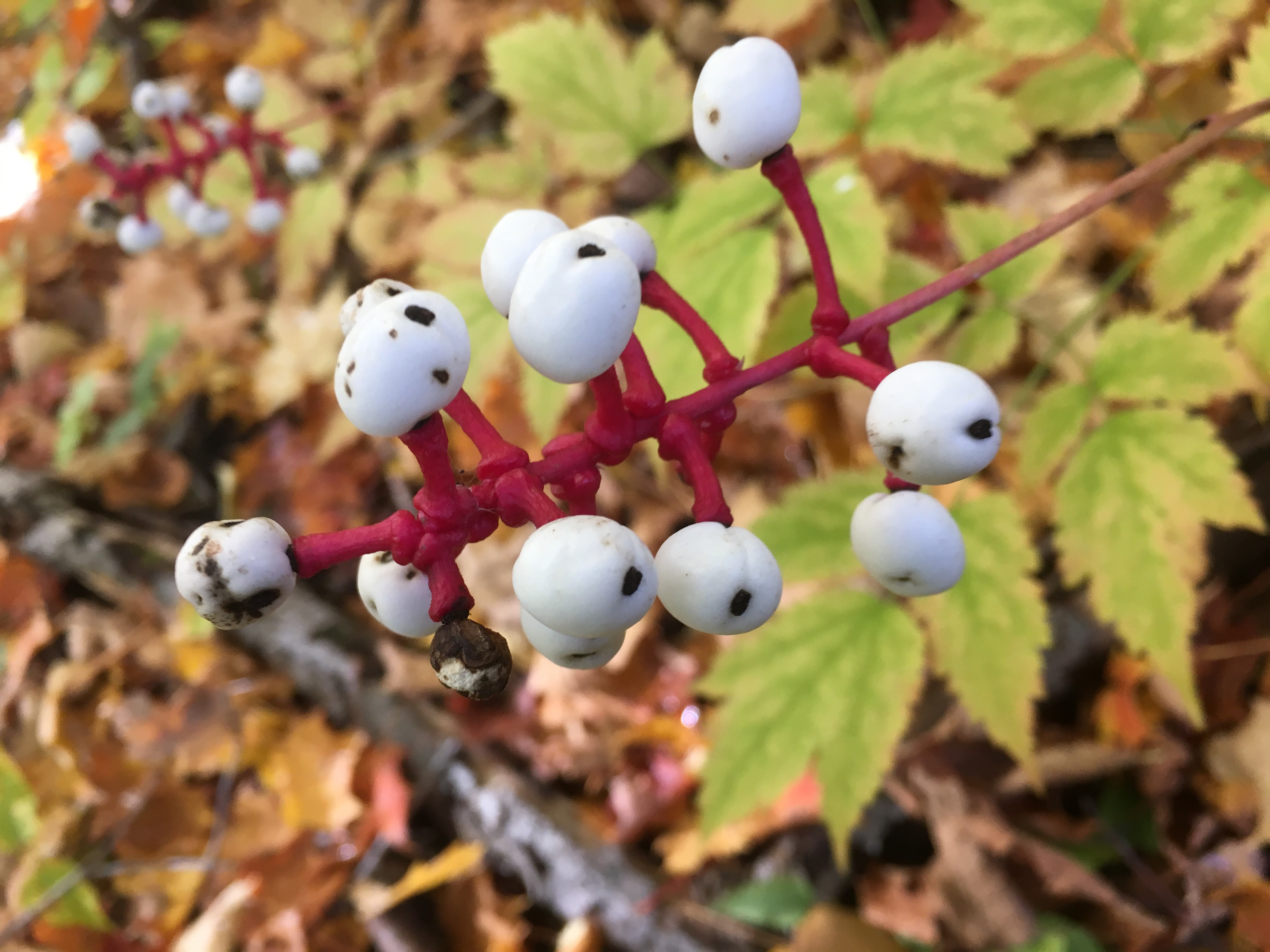 Red trilliums are less common in this forest than the white ones but there were a few examples scattered around. It is said that ants often carry the seeds of trilliums underground and then eat only the outer part leaving the seed to germinate. Once a trillium starts it will take between 4 and 15 years to flower the first time after which it will flower annually. However, if they are picked it sets them back and they can take up to seven years before they start to flower again.