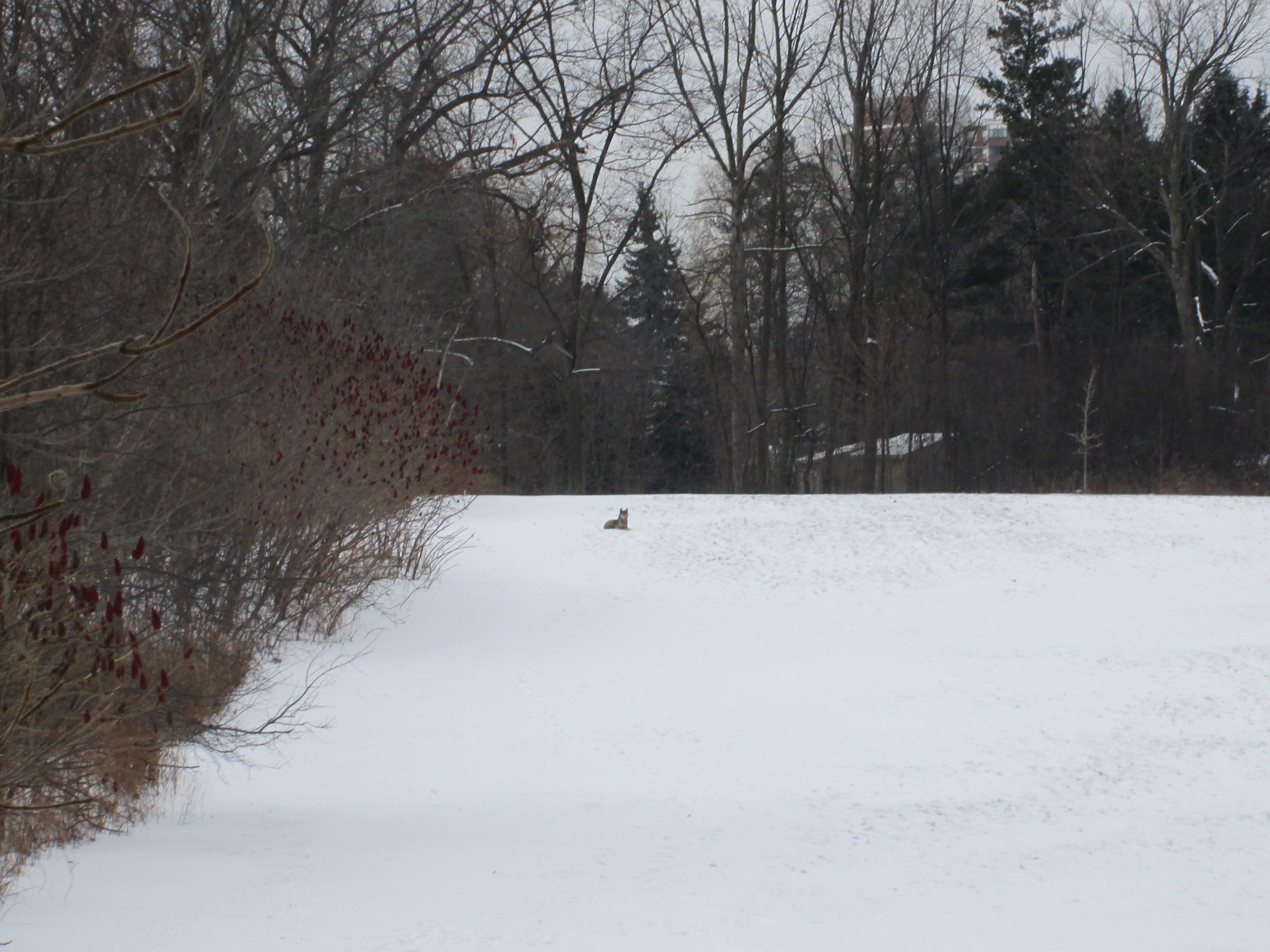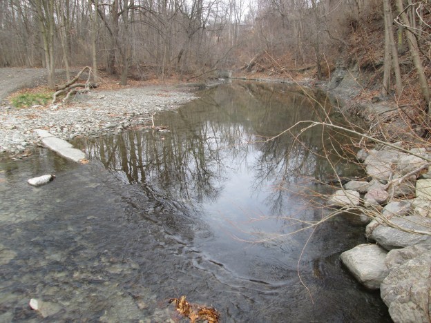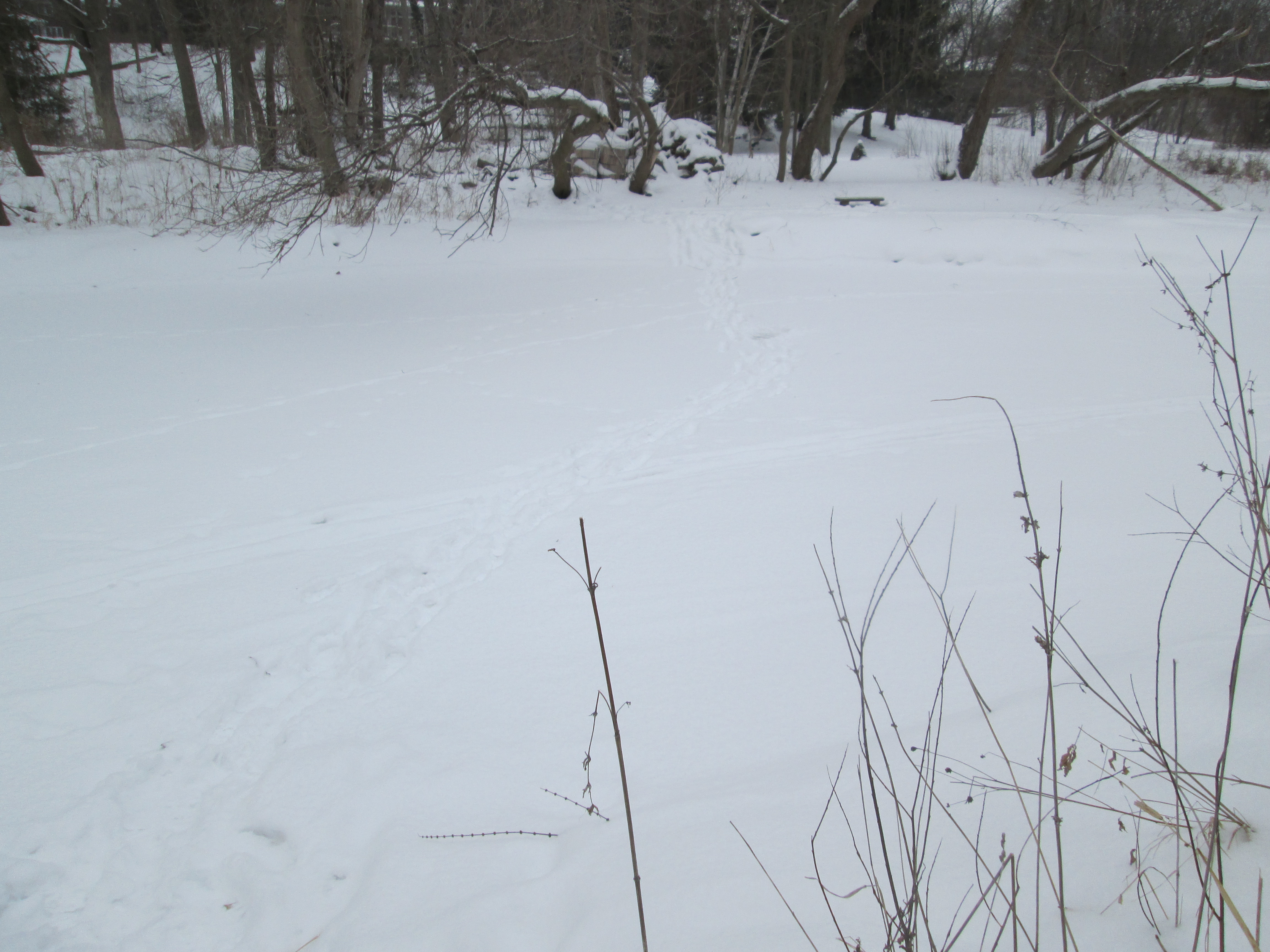 The weatherman has been calling for a very cold weekend with wind chills in the range of -40, but this morning it was only -7 feeling like -18. We parked in West Deane Park and headed south along the east side of Mimico Creek. After the trail passes under Martin Grove Road the park changes names to become Ravenscrest Park.