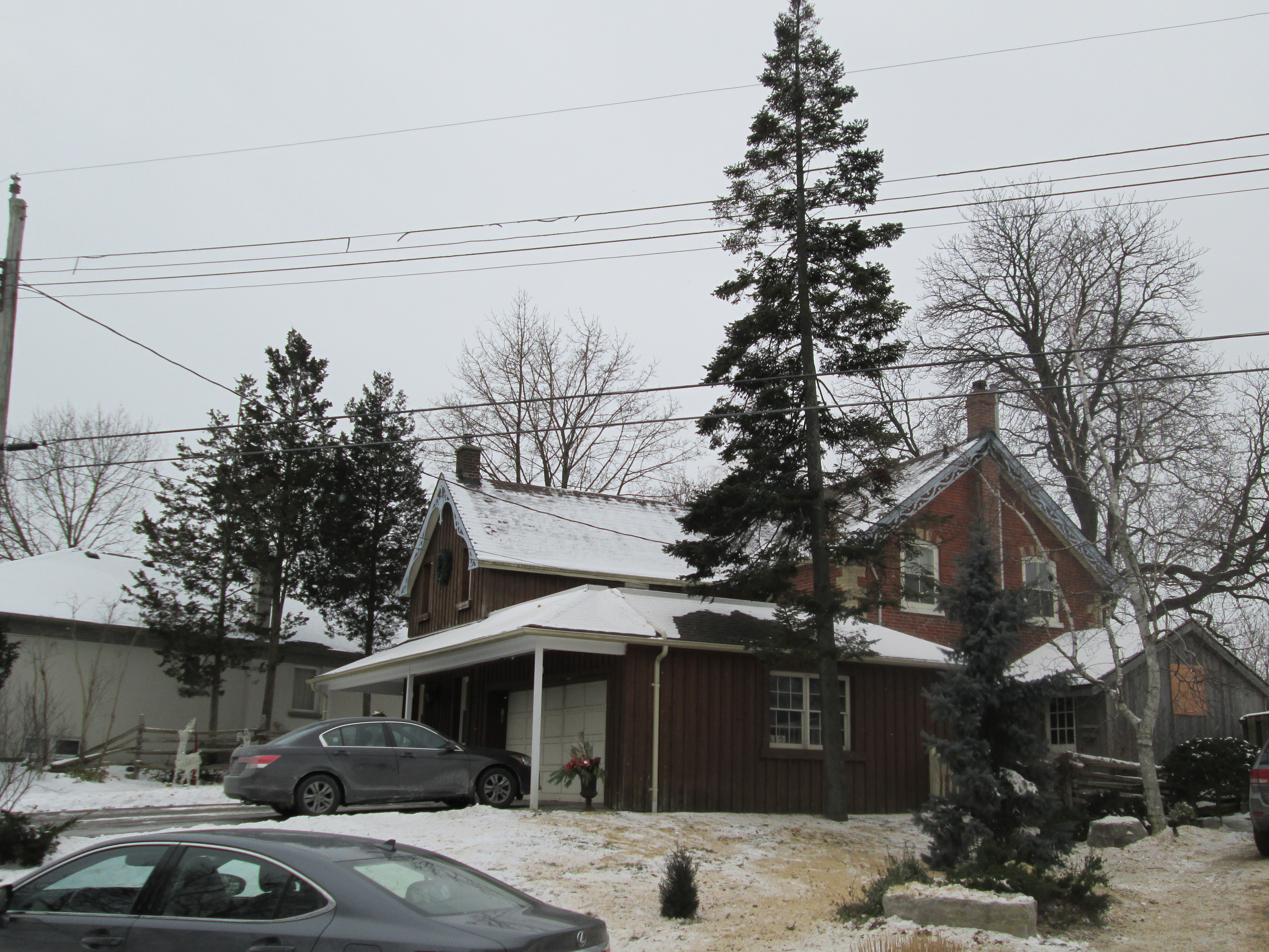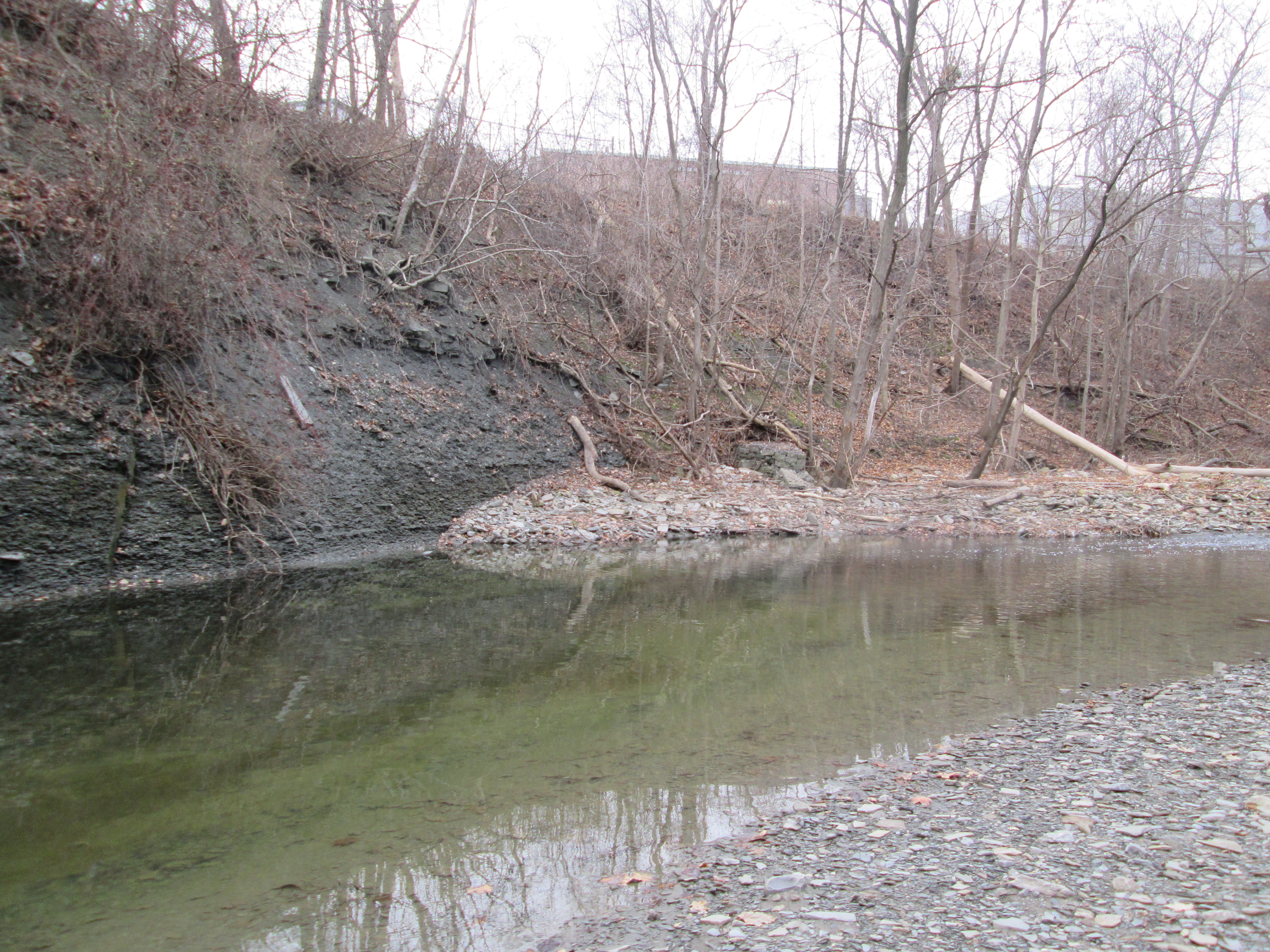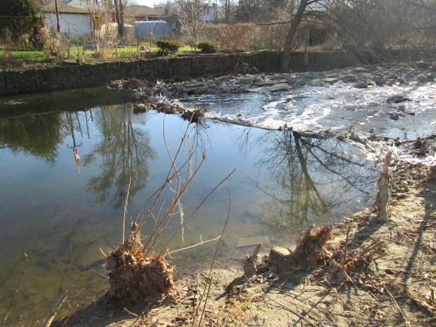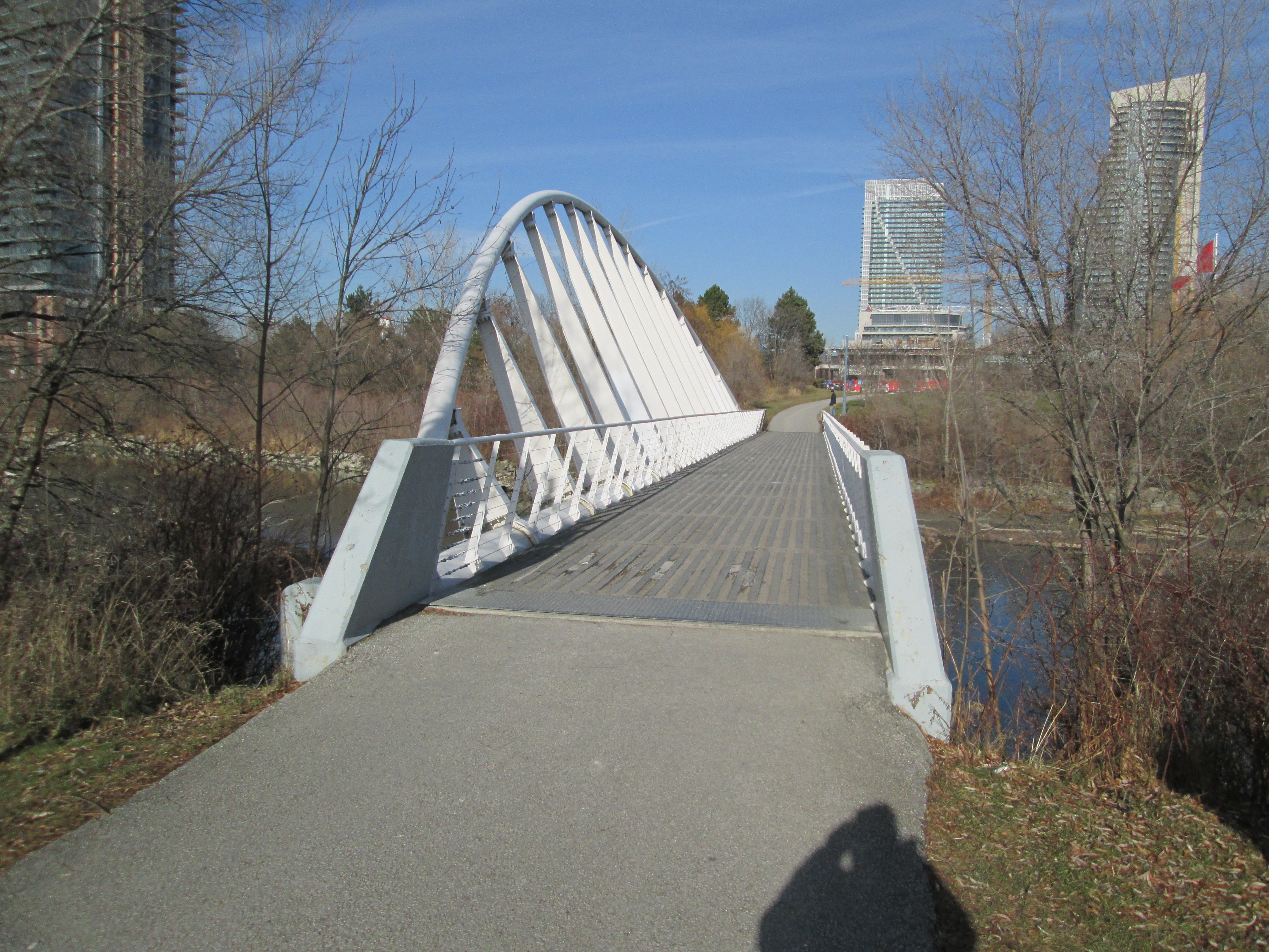 The ice on Mimico Creek is several inches thick in most places and people have been going back and forth. On the opposite side of the creek is an ornate bench that someone has crossed over to examine. Perhaps it was just a two minute bench minor.