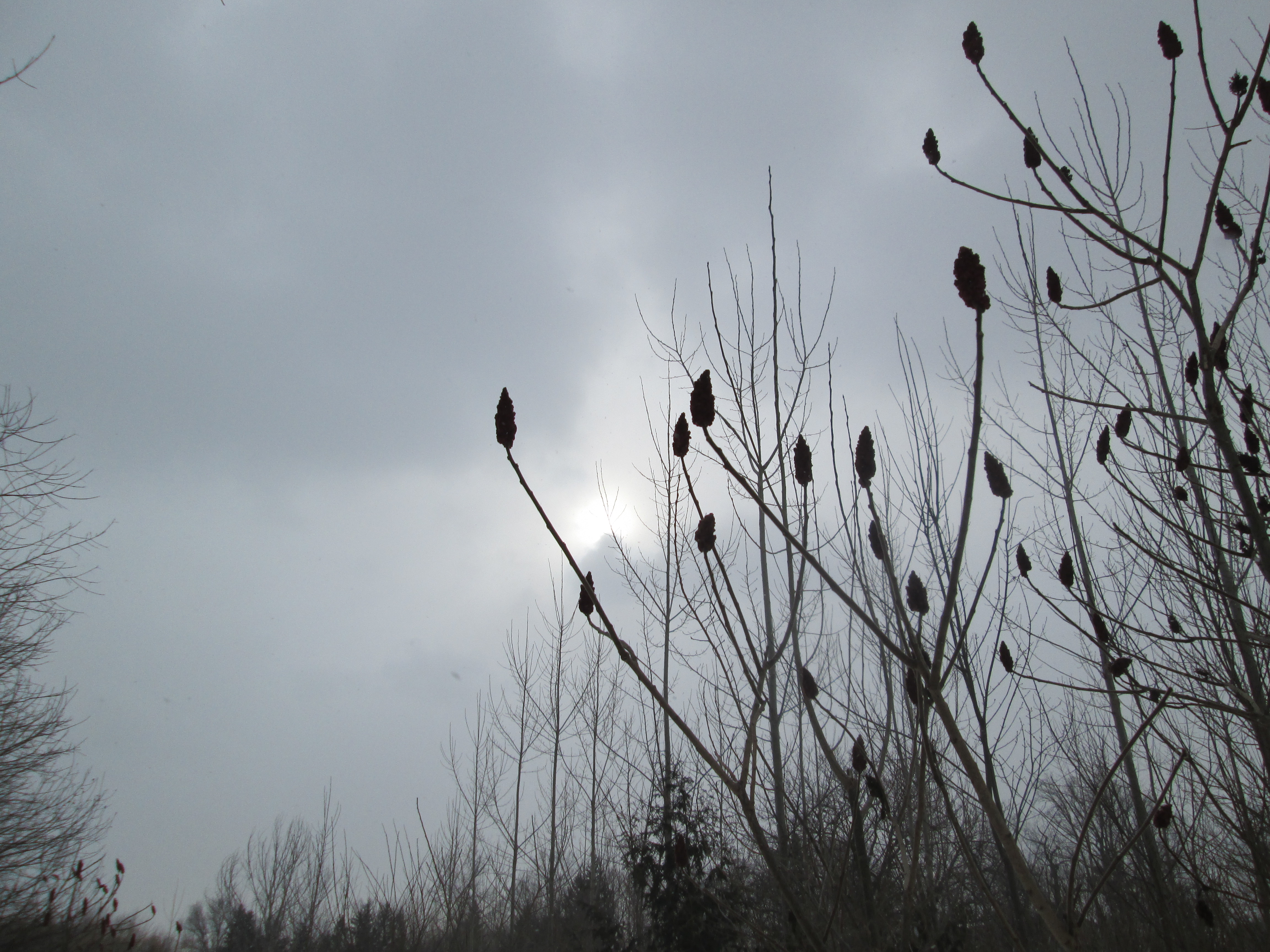 Sumacs are one of the first plants to take hold on previously cleared land. They can reach heights of over thirty feet and produce a type of fruit known as a drupe. These clusters of reddish fruit are known as sumac bobs and form the tips of each branch. Sumac is used as a spice in some middle eastern foods and also as a dye. The drupes are used as a winter source of food for birds who spread the seeds through their droppings. In the picture below sumac bobs frame the sun as it was peeking out from behind the clouds.