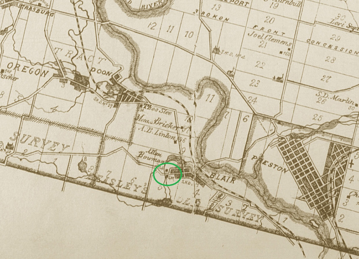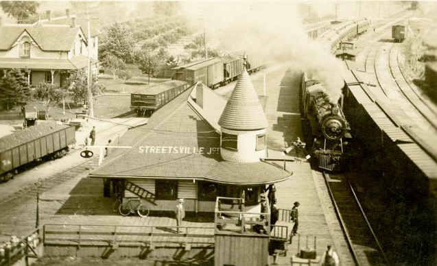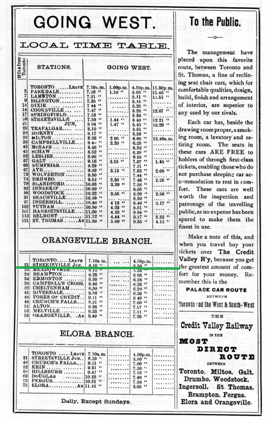 This 1883 timetable was taken from Old Time Trains on www.trainweb.org and further reading can be found there. Streetsville Junction was on the Orangeville Branch and is underlined in green.