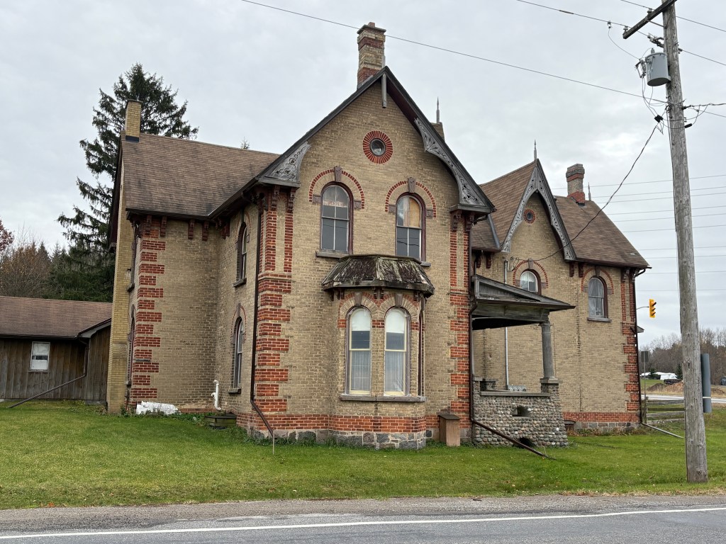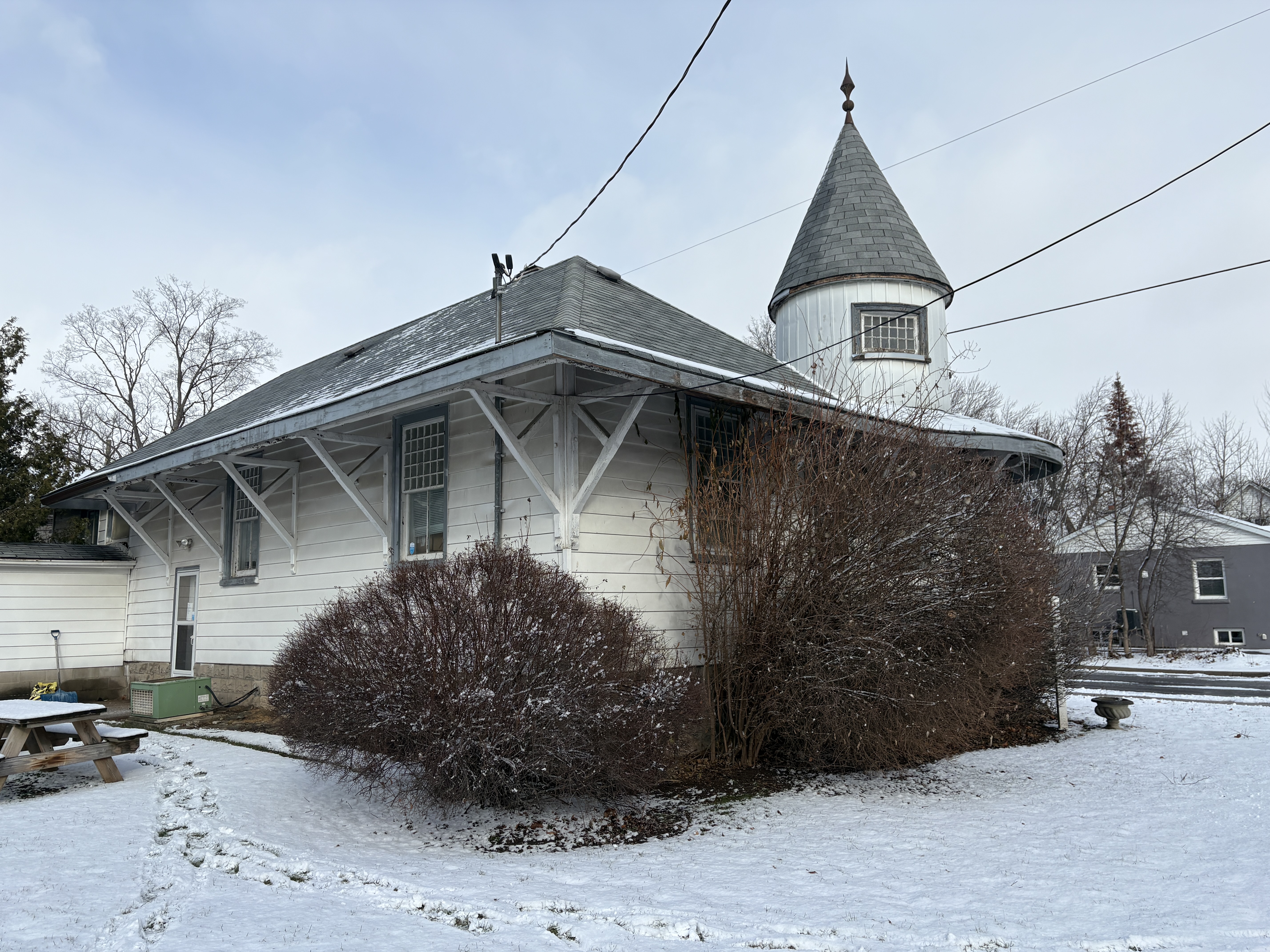 The station in Streetsville was built about 1.5 kilometres north of the main part of town at the point where the CVR split with one set of tracks going to Orangeville and the other going to St. Thomas. The rectangular building features a two storey turret on the south-east corner. The tower was decorative as well as practical as it allowed view down both sets of tracks to see what traffic was on the line at Streestville Junction. The tower still shows its board and batten construction although the rest of the building has been clad over in aluminum siding.