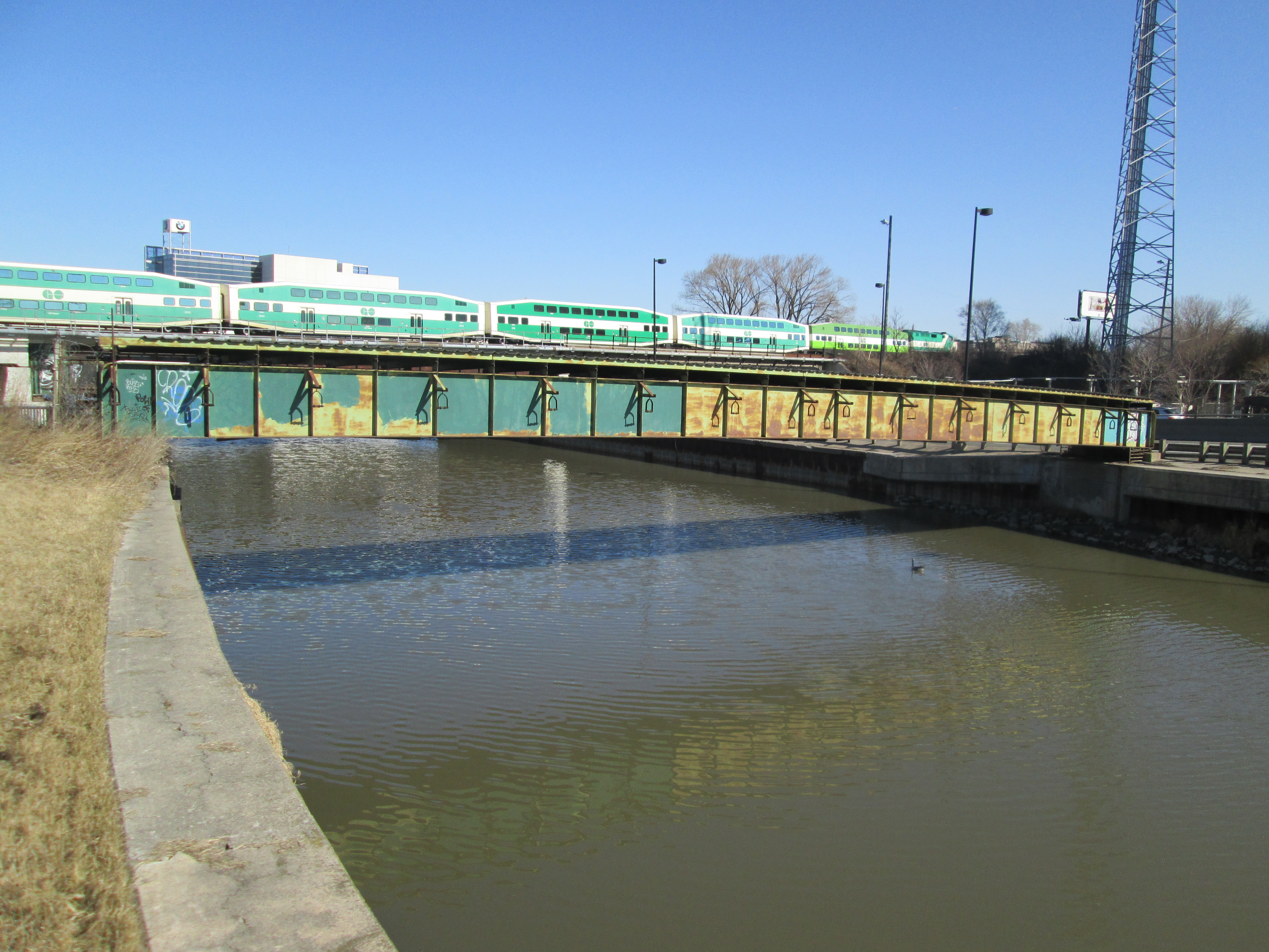 The aerial photograph below is from 1957 and was taken from the Toronto Archives. It shows the straightened Don River making a hard 90 degree turn into the Keating Channel. The buildings of the Toronto Dry Dock Company Ltd and Toronto Ship Building line the south side of the channel with the existing buildings circled in green. At the edge of the channel a ship is currently sitting in dry dock (also circled).